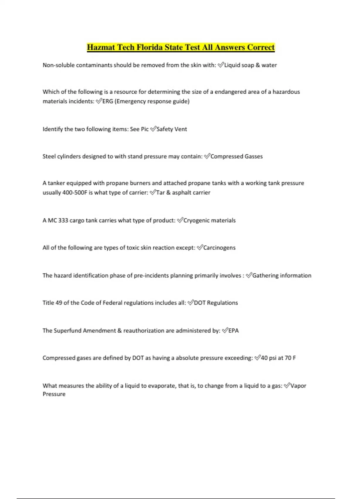 Hazmat Tech Florida State Test All Answers Correct Non-soluble contaminants should be removed from the skin with: Liquid soap & water Which of the following is a resource for determining the size of a endangered area of a hazardous materials incidents: ERG (Emergency response guide) Identify the two following items: See Pic Safety Vent Steel cylinders designed to with stand pressure may contain: Compressed Gasses A tanker equipped with propane burners and attached propane tanks with a working tank pressure usually 400-500F is what type of carrier: Tar & asphalt carrier A MC 333 cargo tank carries what type of product: Cryogenic materials All of the following are types of toxic skin reaction except: Carcinogens The hazard identification phase of pre-incidents planning primarily involves : Gathering information Title 49 of the Code of Federal regulations includes all: DOT Regulations The Superfund Amendment & reauthorization are administered by: EPA Compressed gases are defined by DOT as having a absolute pressure exceeding: 40 psi at 70 F What measures the ability of a liquid to evaporate, that is, to change from a liquid to a gas: Vapor Pressure On a combustible gas indicator with a reading in % LRL, the reading indicate 0-100% of: The lower explosive limit Which of the following chemicals can produce methemoglobinemia: Nitrates The longest approved airline for supplied air respirators are: 300 ft A placard with a Class Division number 4.2 at the bottom of the placard would be: Spontaneous combustible material How are subsidiary placards be distinguished from primary placards: Subsidiary placards do not carry class or UN number If your monitoring a gas with a LEL of 2% and your combustible gas indicator reading 50% LEL what is t
