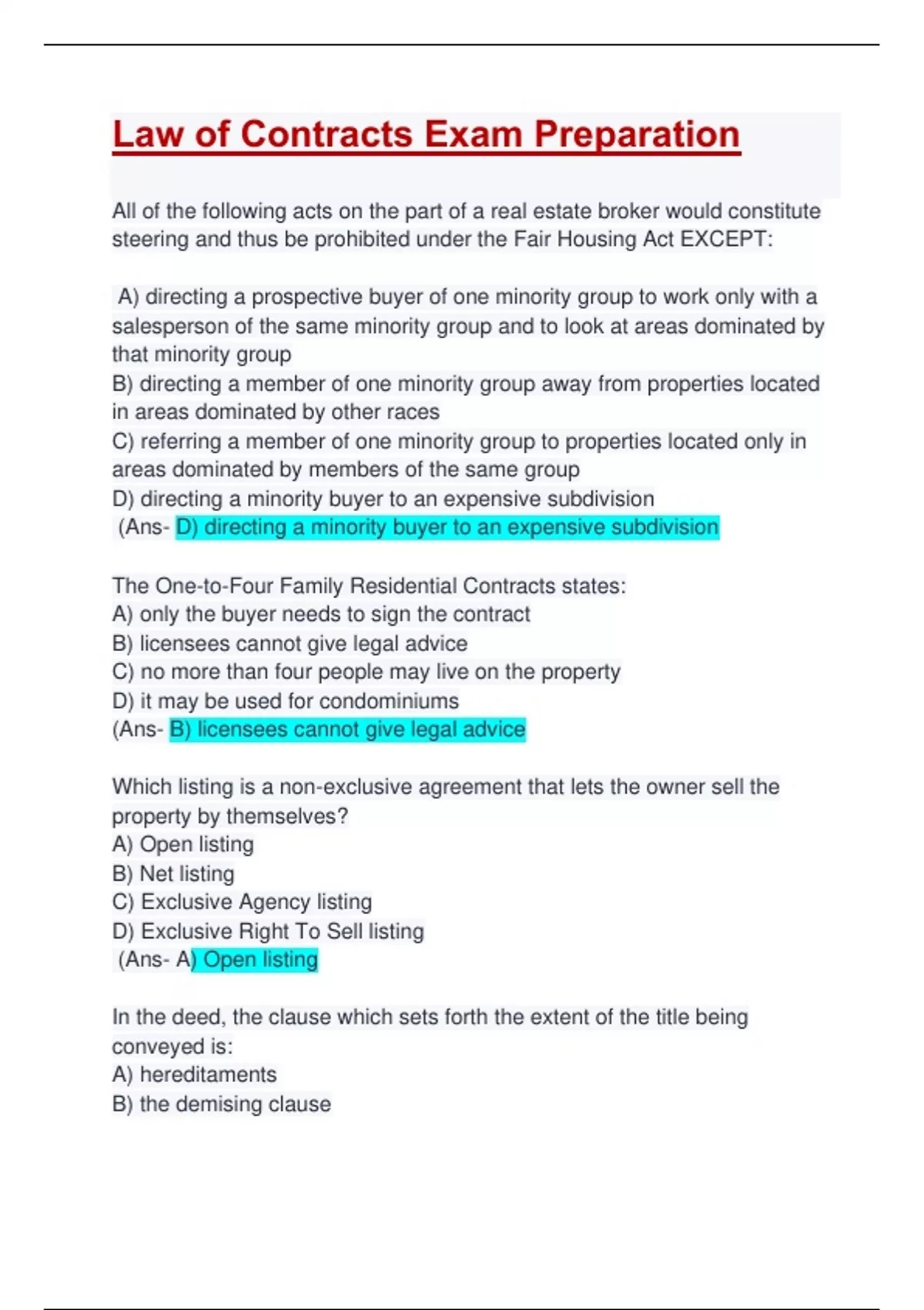 All of the following acts on the part of a real estate broker would constitute steering and thus be prohibited under the Fair Housing Act EXCEPT: A) directing a prospective buyer of one minority group to work only with a salesperson of the same minority group and to look at areas dominated by that minority group B) directing a member of one minority group away from properties located in areas dominated by other races C) referring a member of one minority group to properties located only in areas dominated by members of the same group D) directing a minority buyer to an expensive subdivision (Ans- D) directing a minority buyer to an expensive subdivision The One-to-Four Family Residential Contracts states: A) only the buyer needs to sign the contract B) licensees cannot give legal advice C) no more than four people may live on the property D) it may be used for condominiums (Ans- B) licensees cannot give legal advice Which listing is a non-exclusive agreement that lets the owner sell the property by themselves? A) Open listing B) Net listing C) Exclusive Agency listing D) Exclusive Right To Sell listing (Ans- A) Open listing In the deed, the clause which sets forth the extent of the title being conveyed is: A) hereditaments B) the demising clause C) the indenture clause D) the habendum clause (Ans- D) the habendum clause When one of the parties of a contract may legally reject it, the contract is said to be: A) voidable B) void C) unenforceable