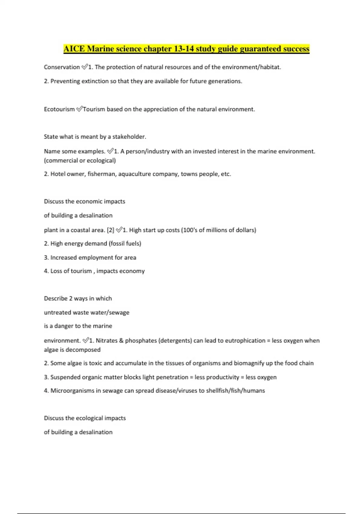 AICE Marine science chapter 13-14 study guide guaranteed success Conservation 1. The protection of natural resources and of the environment/habitat. 2. Preventing extinction so that they are available for future generations. Ecotourism Tourism based on the appreciation of the natural environment. State what is meant by a stakeholder. Name some examples. 1. A person/industry with an invested interest in the marine environment. (commercial or ecological) 2. Hotel owner, fisherman, aquaculture company, towns people, etc. Discuss the economic impacts of building a desalination plant in a coastal area. [2] 1. High start up costs (100's of millions of dollars) 2. High energy demand (fossil fuels) 3. Increased employment for area 4. Loss of tourism , impacts economy Describe 2 ways in which untreated waste water/sewage is a danger to the marine environment. 1. Nitrates & phosphates (detergents) can lead to eutrophication = less oxygen when algae is decomposed 2. Some algae is toxic and accumulate in the tissues of organisms and biomagnify up the food chain 3. Suspended organic matter blocks light penetration = less productivity = less oxygen 4. Microorganisms in sewage can spread disease/viruses to shellfish/fish/humans Discuss the ecological impacts of building a desalination plant in a coastal area. [4] 1. Inflow into pipes sucks up plankton community, resulting in death of organisms....... 2. Impacts food web/predator-prey relationships 3. Brine released to ocean sinks and impacts/kills osmoconformers 4. Water drawn out of body due to osmosis 5. Increased turbidity = less productivity/oxygen 6. Toxic metals can leach from pipes and biomagnify up food chain 7. Less oxygen in water (less soluble in warmer water) Explain the negative ecological impacts of agriculture on the marine environment. [4] 1. Fertilizer (nitrates & phosphate) runoff = eutrophication 2. Algae blooms can be toxic (e.g.- red tide) = organism death 3. Decomposition = less oxygen/not enough to meet respiration needs = less biodiversity. Dead zones/hypoxic zones/anoxic zones 4. Pesticides released can biomagnify toxins up food chain 5. Herbicides can kill producers Outline the effects of the accumulation of a named toxin in marine food chains. [4] 1. Hg (neurotoxin)/TBT (imposex in bivalves)/other named toxin....isn't broken down 2. Uptaken into the food chain by producers 3. Many producers are consumed by primary consumers who now have the toxin = bioaccumulation of toxins in tissue of consumers 4. Concentration of the toxin increases with each trophic level (biomagnification), with top consum