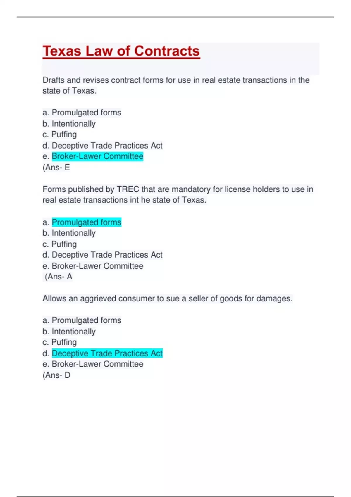 Drafts and revises contract forms for use in real estate transactions in the state of Texas. a. Promulgated forms b. Intentionally c. Puffing d. Deceptive Trade Practices Act e. Broker-Lawer Committee (Ans- E Forms published by TREC that are mandatory for license holders to use in real estate transactions int he state of Texas. a. Promulgated forms b. Intentionally c. Puffing d. Deceptive Trade Practices Act e. Broker-Lawer Committee (Ans- A Allows an aggrieved consumer to sue a seller of goods for damages. a. Promulgated forms b. Intentionally c. Puffing d. Deceptive Trade Practices Act e. Broker-Lawer Committee (Ans- D Acting with awareness or