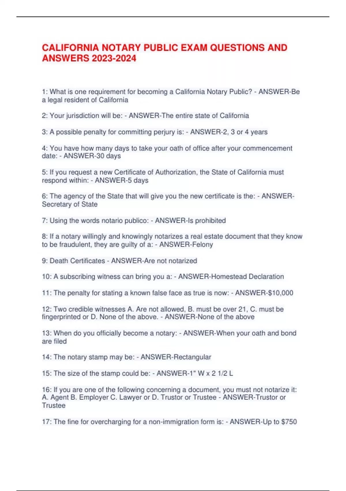 CALIFORNIA NOTARY PUBLIC EXAM QUESTIONS AND ANSWERS