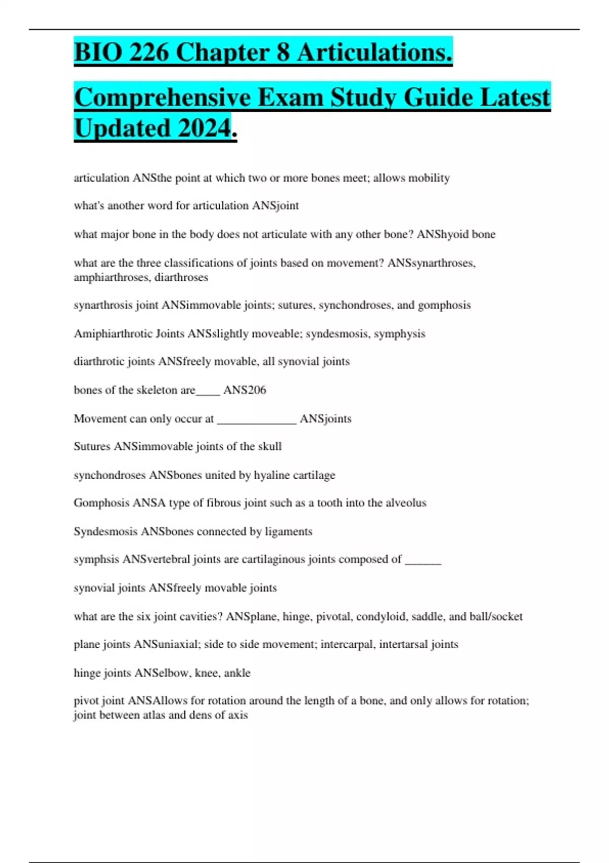 BIO 226 Chapter 8 Articulations. Comprehensive Exam Study Guide Latest Updated 2024
