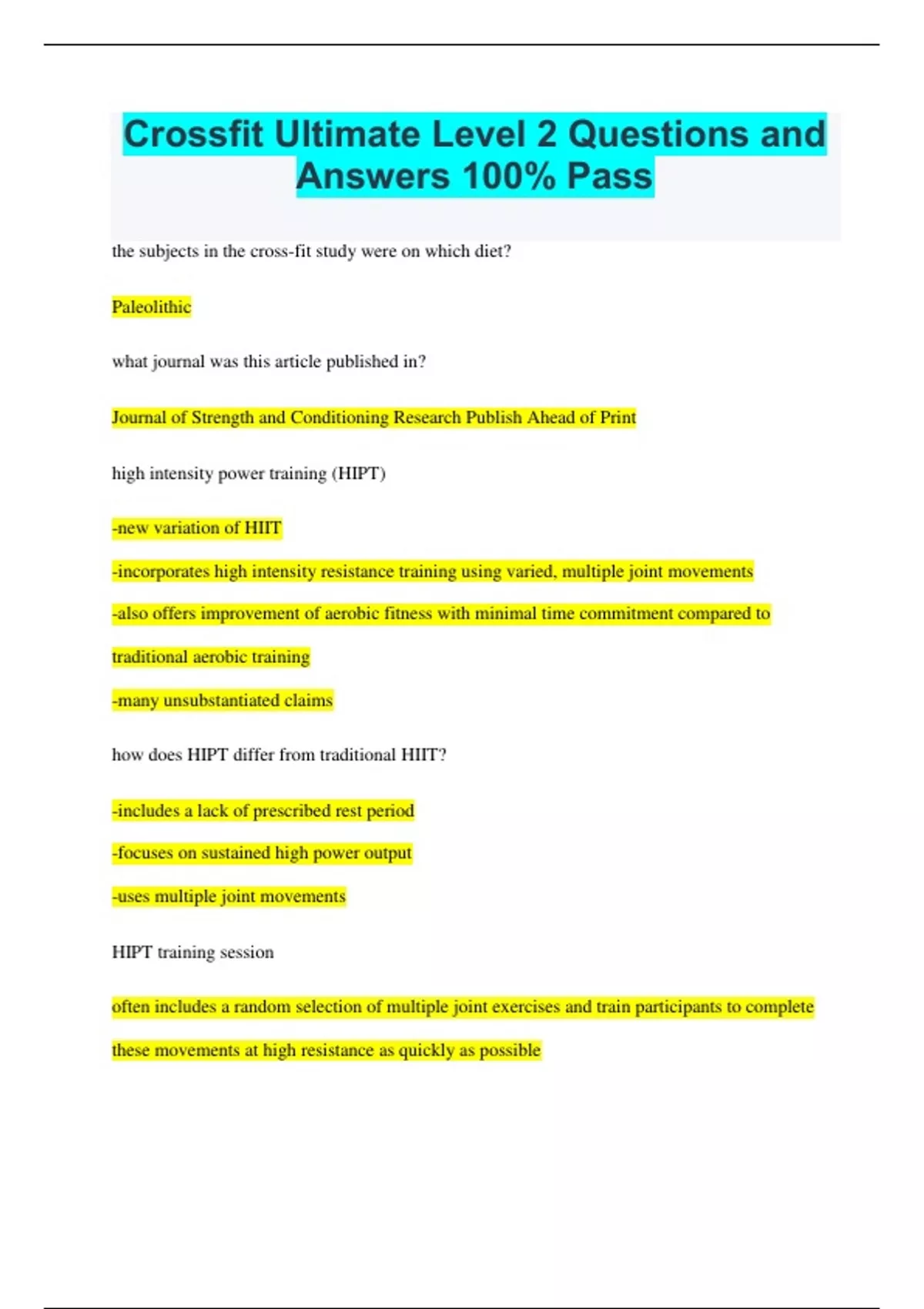 Crossfit Ultimate Level 2 Questions and Answers 100% Pass the subjects in the cross-fit study were on which diet? Paleolithic what journal was this article published in? Journal of Strength and Conditioning Research Publish Ahead of Print high intensity power training (HIPT) -new variation of HIIT -incorporates high intensity resistance training using varied, multiple joint movements -also offers improvement of aerobic fitness with minimal time commitment compared to traditional aerobic training -many unsubstantiated claims how does HIPT differ from traditional HIIT? -includes a lack of prescribed rest period -focuses on sustained high power output -uses multiple joint movements HIPT training session often includes a random selection of multiple joint exercises and train participants to complete these movements at high resistance as quickly as possible