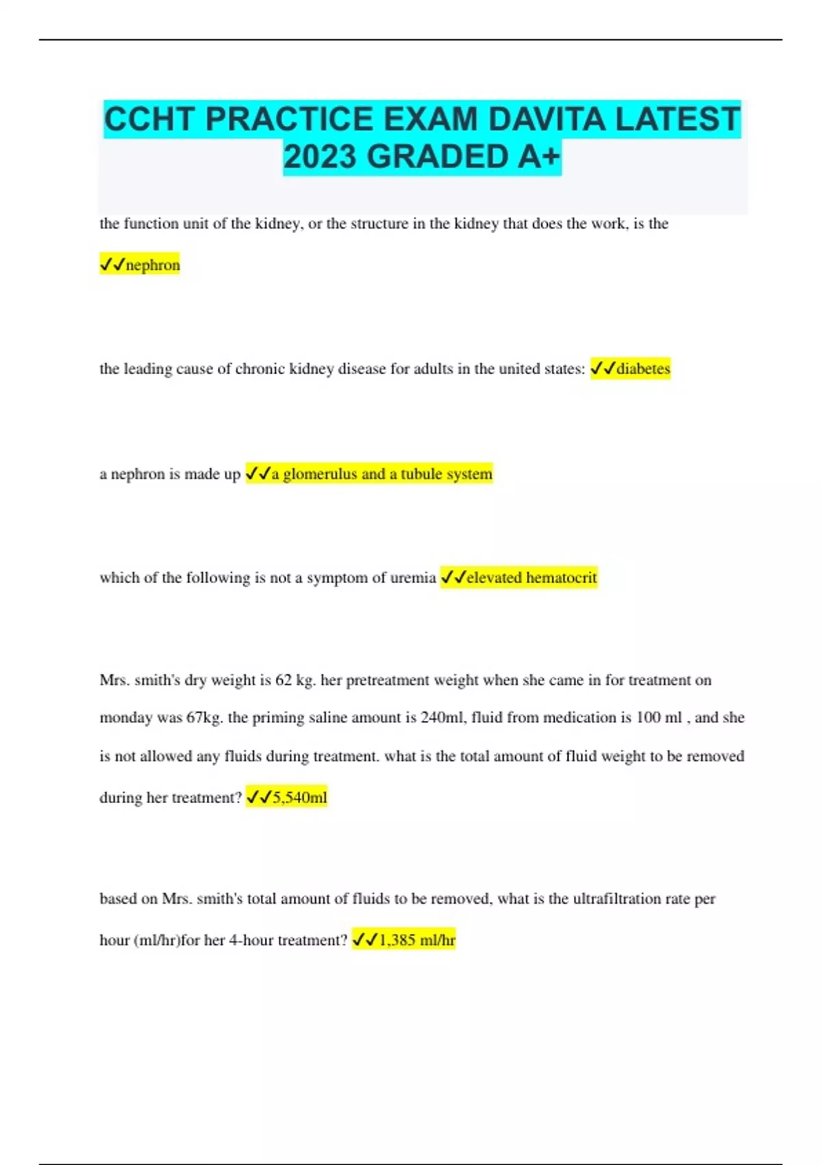 CCHT PRACTICE EXAM DAVITA LATEST 2023 GRADED A+ the function unit of the kidney, or the structure in the kidney that does the work, is the nephron the leading cause of chronic kidney disease for adults in the united states: diabetes a nephron is made up a glomerulus and a tubule system which of the following is not a symptom of uremia elevated hematocrit Mrs. smith's dry weight is 62 kg. her pretreatment weight when she came in for treatment on monday was 67kg. the priming saline amount is 240ml, fluid from medication is 100 ml , and she is not allowed any fluids during treatment. what is the total amount of fluid weight to be removed during her treatment? 5,540ml