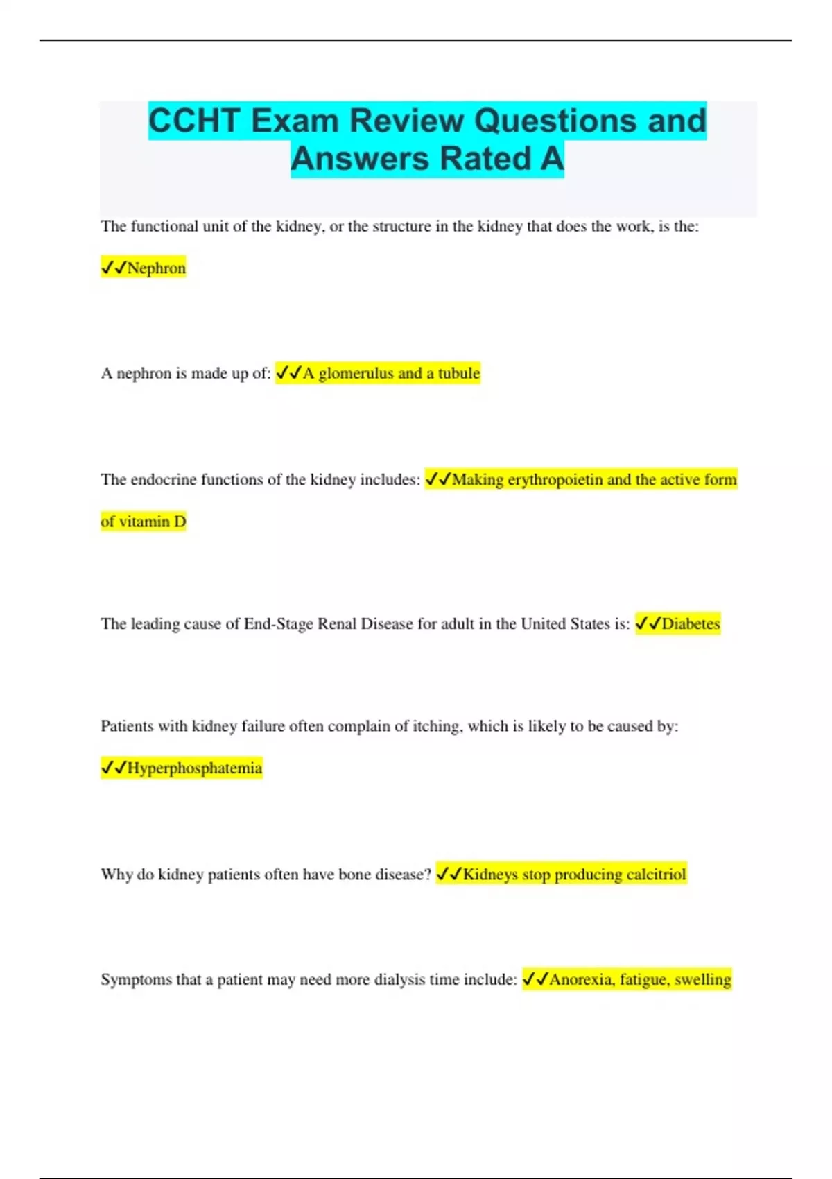 CCHT Exam Review Questions and Answers Rated A The functional unit of the kidney, or the structure in the kidney that does the work, is the: Nephron A nephron is made up of: A glomerulus and a tubule The endocrine functions of the kidney includes: Making erythropoietin and the active form of vitamin D The leading cause of End-Stage Renal Disease for adult in the United States is: Diabetes Patients with kidney failure often complain of itching, which is likely to be caused by: Hyperphosphatemia