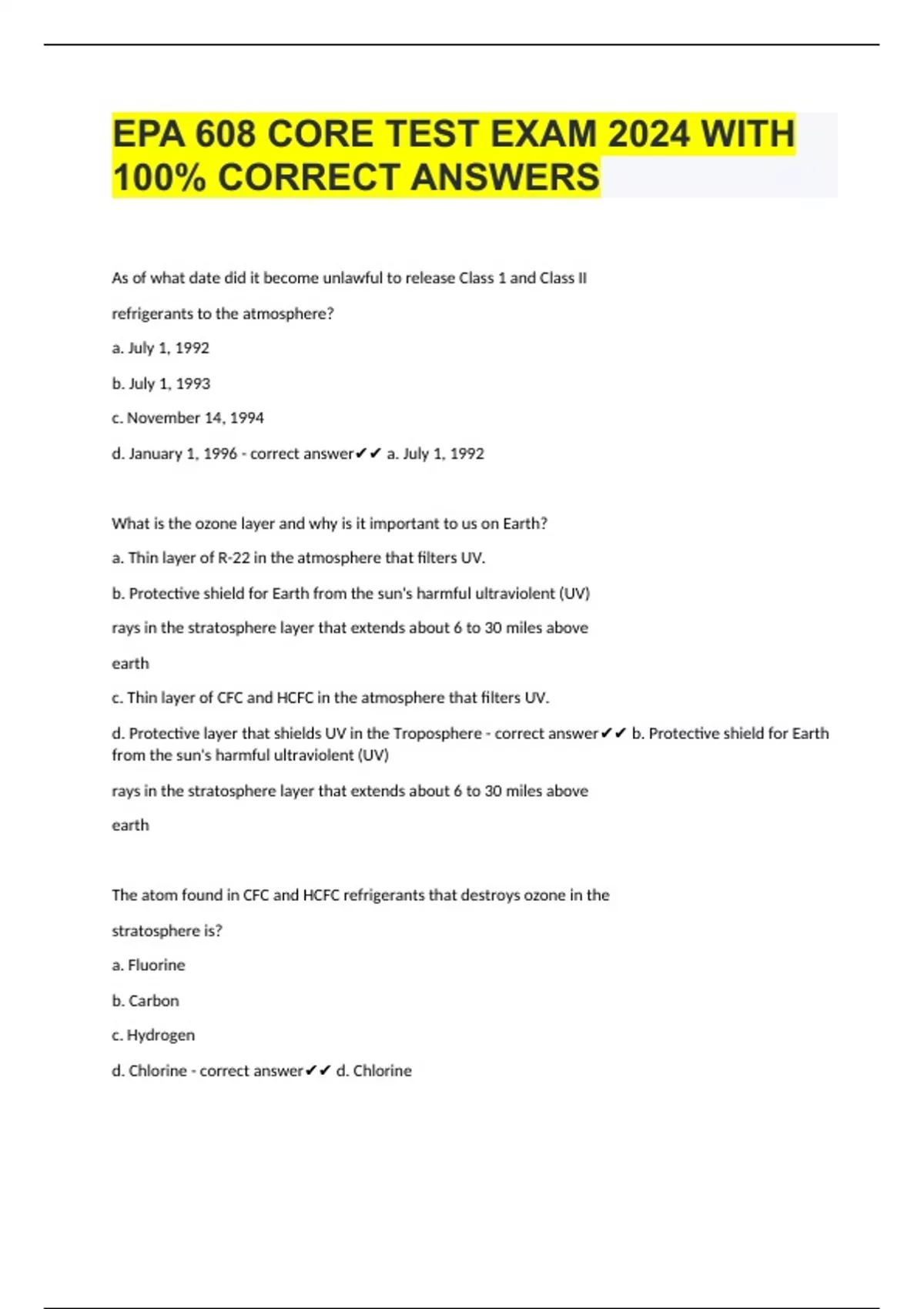 As of what date did it become unlawful to release Class 1 and Class II refrigerants to the atmosphere? a. July 1, 1992 b. July 1, 1993 c. November 14, 1994 d. January 1, 1996 - correct answer a. July 1, 1992 What is the ozone layer and why is it important to us on Earth? a. Thin layer of R-22 in the atmosphere that filters UV. b. Protective shield for Earth from the sun's harmful ultraviolent (UV) rays in the stratosphere layer that extends about 6 to 30 miles above earth c. Thin layer of CFC and HCFC in the atmosphere that filters UV. d. Protective layer that shields UV in the Troposphere - correct answer b. Protective shield for Earth from the sun's harmful ultraviolent (UV) rays in the stratosphere layer that extends about 6 to 30 miles above earth The atom found in CFC and HCFC refrigerants that destroys ozone in the stratosphere is