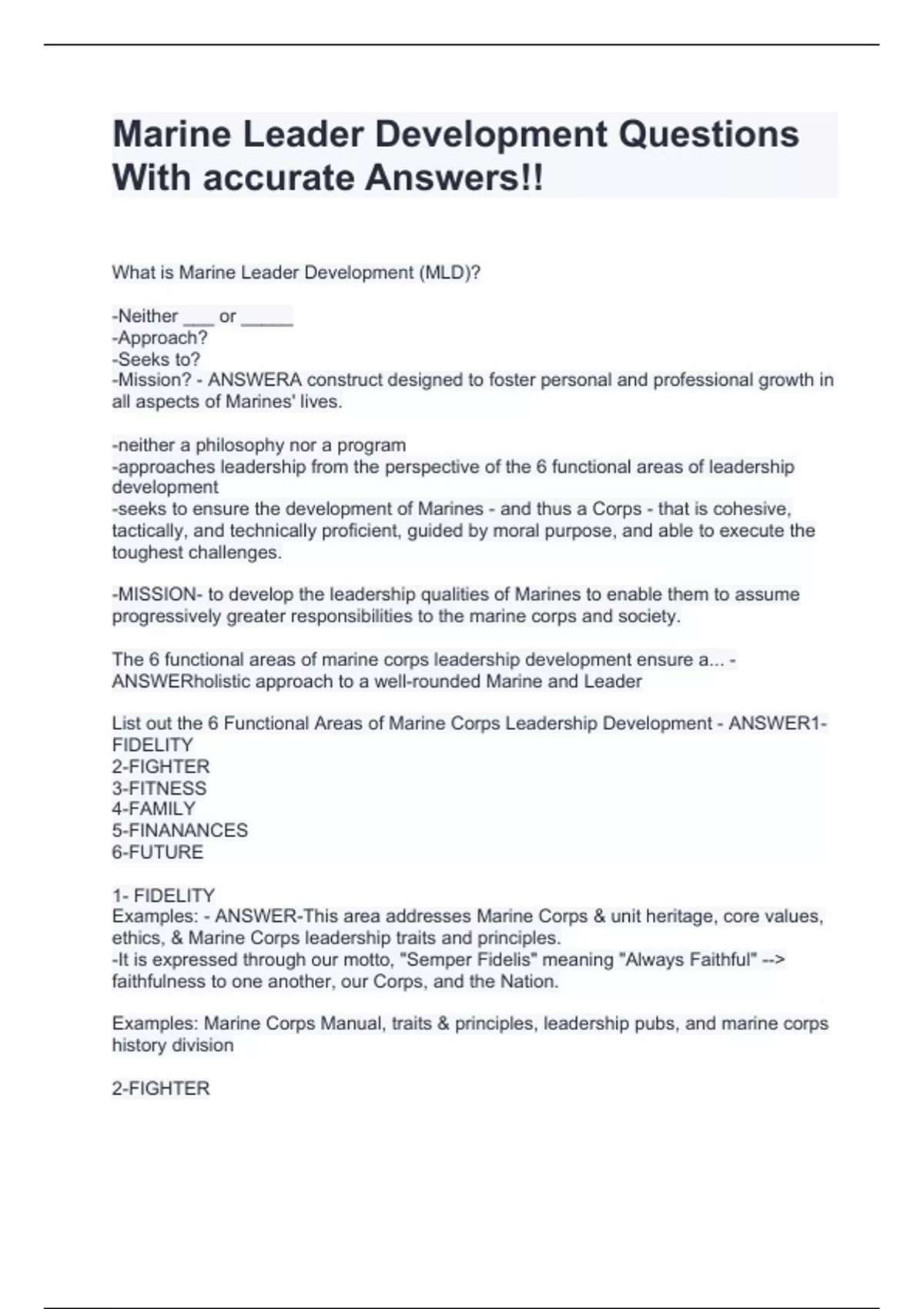 Marine Leader Development Questions With accurate Answers!! What is Marine Leader Development (MLD)? -Neither ___ or _____ -Approach? -Seeks to? -Mission? - ANSWERA construct designed to foster personal and professional growth in all aspects of Marines' lives. -neither a philosophy nor a program -approaches leadership from the perspective of the 6 functional areas of leadership development -seeks to ensure the development of Marines - and thus a Corps - that is cohesive, tactically, and technically proficient, guided by moral purpose, and able to execute the toughest challenges. -MISSION- to develop the leadership qualities of Marines to enable them to assume progressively greater responsibilities to the marine corps and society. The 6 functional areas of marine corps leadership development ensure a... - ANSWERholistic approach to a well-rounded Marine and Leader List out the 6 Functional Areas of Marine Corps Leadership Development - ANSWER1-FIDELITY 2-FIGHTER 3-FITNESS 4-FAMILY 5-FINANANCES 6-FUTURE 1- FIDELITY Examples: - ANSWER-This area addresses Marine Corps & unit heritage, core values, ethics, & Marine Corps leadership traits and principles. -It is expressed through our motto, "Semper Fidelis" meaning "Always Faithful" --> faithfulness to one another, our Corps, and the Nation.
