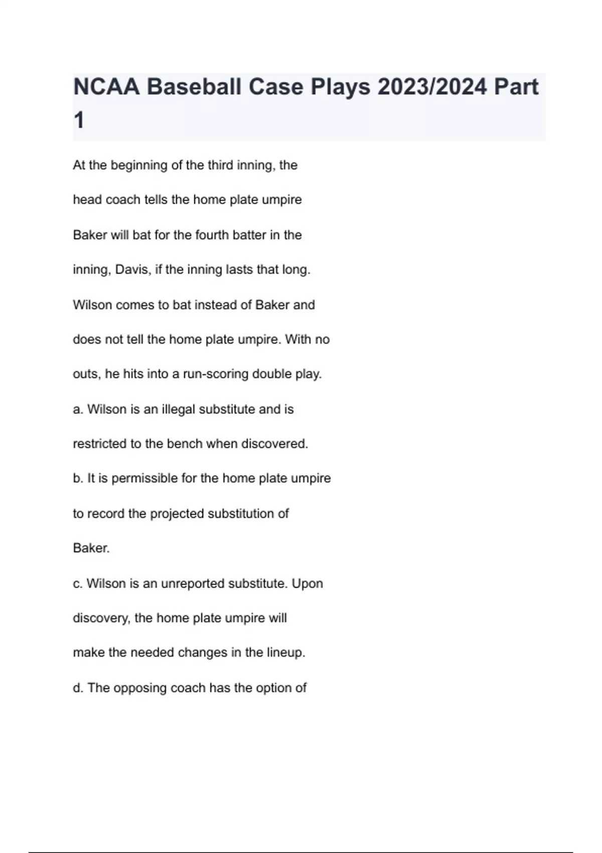 NCAA Baseball Case Plays 2023/2024 Part 1 (Answered) With Complete Verified Solution