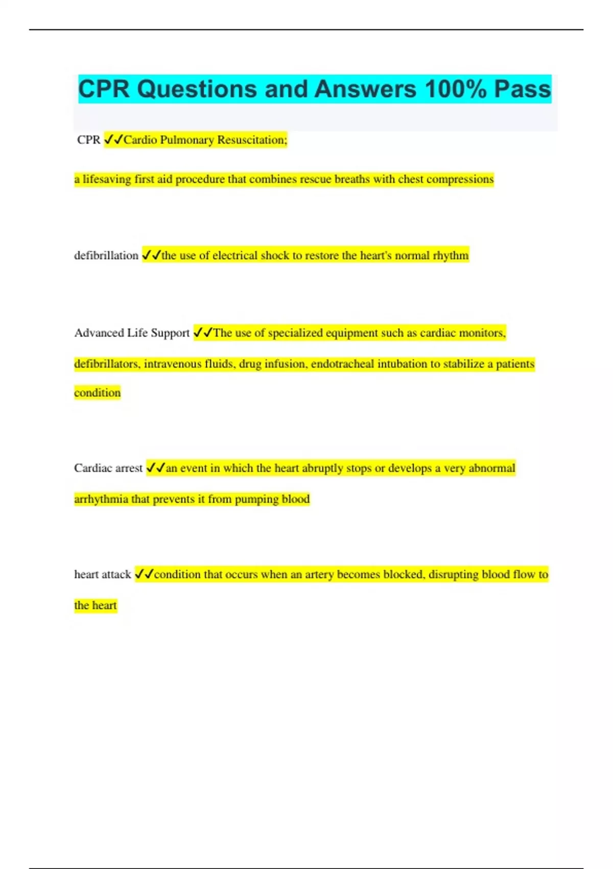CPR Questions and Answers 100% Pass CPR Cardio Pulmonary Resuscitation; a lifesaving first aid procedure that combines rescue breaths with chest compressions defibrillation the use of electrical shock to restore the heart's normal rhythm Advanced Life Support The use of specialized equipment such as cardiac monitors, defibrillators, intravenous fluids, drug infusion, endotracheal intubation to stabilize a patients condition Cardiac arrest an event in which the heart abruptly stops or develops a very abnormal arrhythmia that prevents it from pumping blood heart attack condition that occurs when an artery becomes blocked, disrupting blood flow to the heart