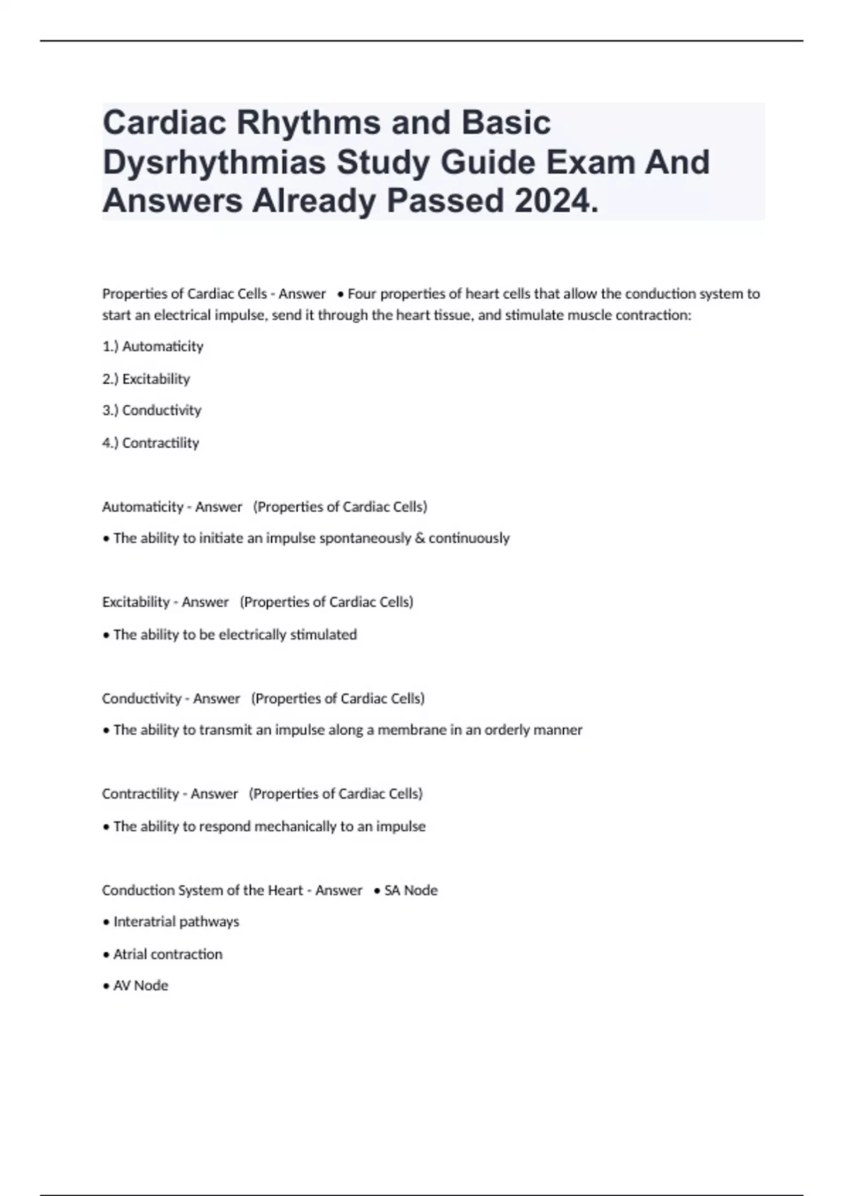 Properties of Cardiac Cells - Answer • Four properties of heart cells that allow the conduction system to start an electrical impulse, send it through the heart tissue, and stimulate muscle contraction: 1.) Automaticity 2.) Excitability 3.) Conductivity 4.) Contractility Automaticity - Answer (Properties of Cardiac Cells) • The ability to initiate an impulse spontaneously & continuously Excitability - Answer (Properties of Cardiac Cells) • The ability to be electrically stimulated Conductivity - Answer (Properties of Cardiac Cells) • The ability to transmit an impulse along a membrane in an orderly manner Contractility - Answer (Properties of Cardiac Cells) • The ability to respond mechanically to an impulse Conduction System of the Heart - Answer • SA Node • Interatrial pathways • Atrial contraction • AV Node