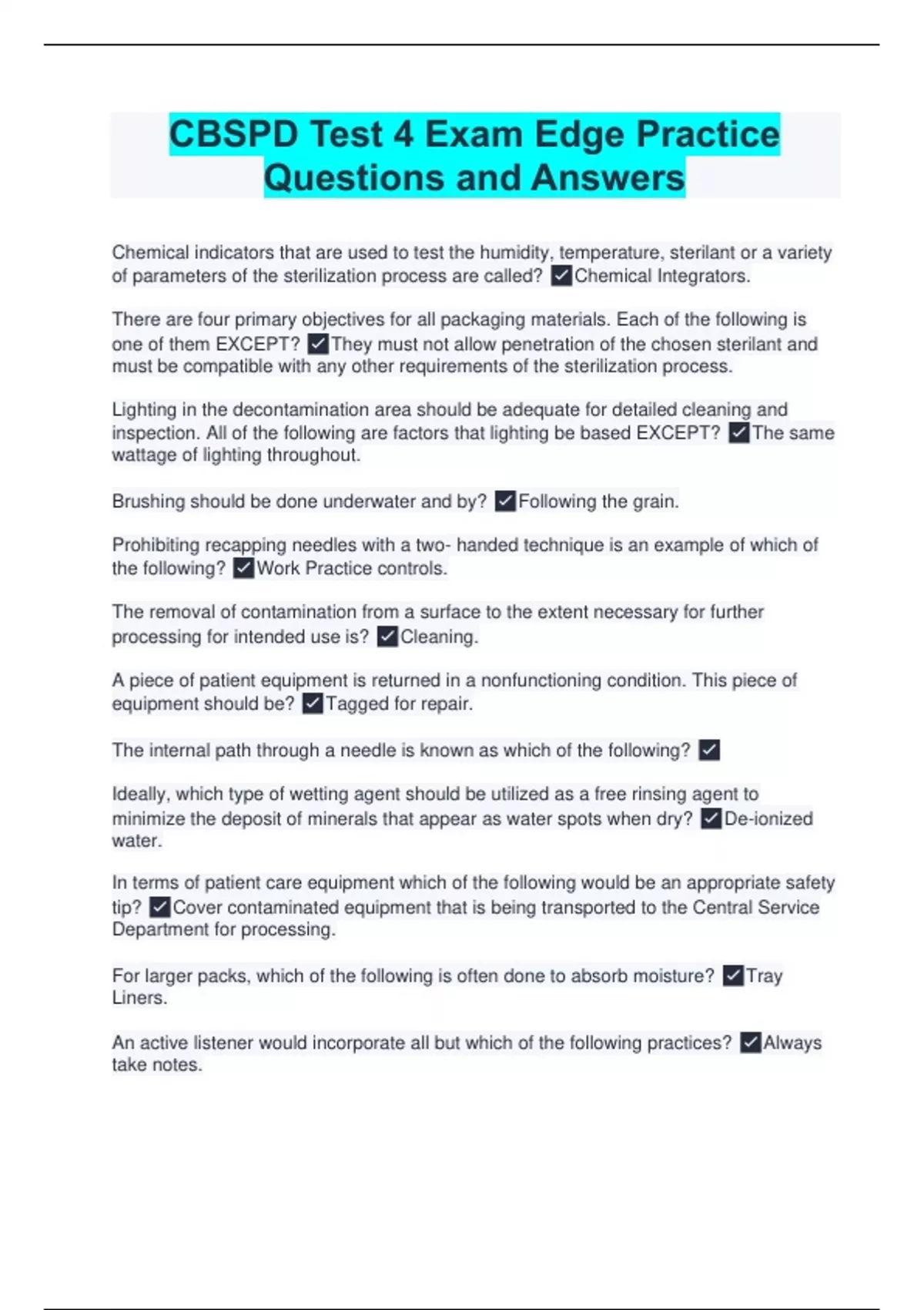 Chemical indicators that are used to test the humidity, temperature, sterilant or a variety of parameters of the sterilization process are called? Chemical Integrators. There are four primary objectives for all packaging materials. Each of the following is one of them EXCEPT? They must not allow penetration of the chosen sterilant and must be compatible with any other requirements of the sterilization process. Lighting in the decontamination area should be adequate for detailed cleaning and inspection. All of the following are factors that lighting be based EXCEPT? The same wattage of lighting throughout. Brushing should be done underwater and by? Following the grain. Prohibiting recapping needles with a two- handed technique is an example of which of the following? Work Practice controls. The removal of contamination from a surface to the extent necessary for further processing for intended use is? Cleaning. A piece of patient equipment is returned in a nonfunctioning condition. This piece of equipment should be? Tagged for repair. The internal path through a needle is known as which of the following? Ideally, which type of wetting agent should be utilized as a free rinsing agent to minimize the deposit of minerals that appear as water spots when dry? De-ionized water. In terms of patient care equipment which of the following would be an appropriate safety tip? Cover contaminated equipment that is being transported to the Central Service Department for processing. For larger packs, which of the following is often done to absorb moisture? Tray Liners. An active listener would incorporate all but which of the following practices? Always take notes.