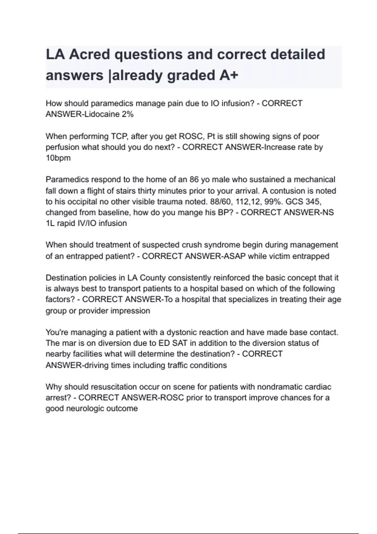 How should paramedics manage pain due to IO infusion? - CORRECT ANSWER-Lidocaine 2% When performing TCP, after you get ROSC, Pt is still showing signs of poor perfusion what should you do next? - CORRECT ANSWER-Increase rate by 10bpm Paramedics respond to the home of an 86 yo male who sustained a mechanical fall down a flight of stairs thirty minutes prior to your arrival. A contusion is noted to his occipital no other visible trauma noted. 88/60, 112,12, 99%. GCS 345, changed from baseline, how do you mange his BP? - CORRECT ANSWER-NS 1L rapid IV/IO infusion When should treatment of suspected crush syndrome begin during management of an entrapped patient? - CORRECT ANSWER-ASAP while victim entrapped Destination policies in LA County consistently reinforced the basic concept that it is always best to transport patients to a hospital based on which of the following factors? - CORRECT ANSWER-To a hospital that specializes in treating their age group or provider impression You're managing a patient with a dystonic reaction and have made base contact. The mar is on diversion due to ED SAT in addition to the diversion status of nearby facilities what will
