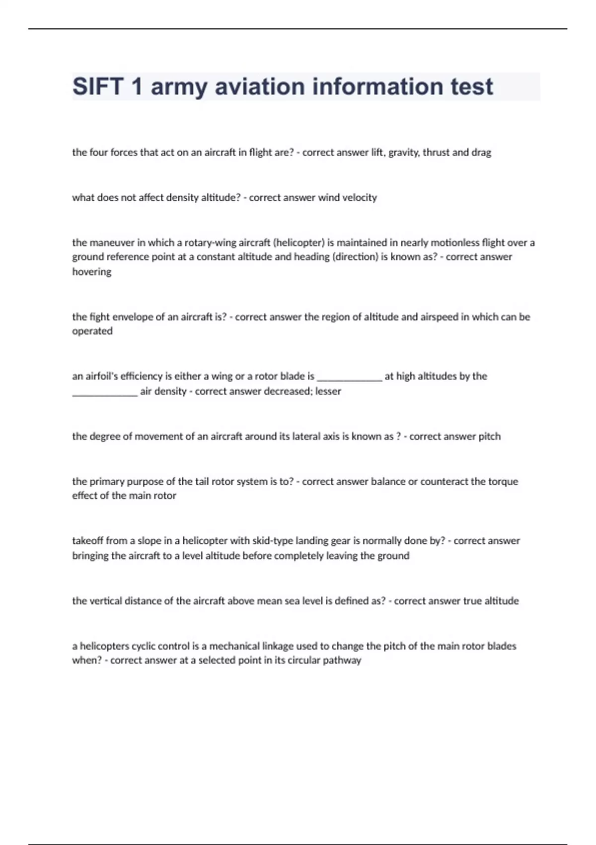 SIFT 1 Army Aviation Information Test Correctly Answered 2024. the four forces that act on an aircraft in flight are? - correct answer lift, gravity, thrust and drag what does not affect density altitude? - correct answer wind velocity the maneuver in which a rotary-wing aircraft (helicopter) is maintained in nearly motionless flight over a ground reference point at a constant altitude and heading (direction) is known as? - correct answer hovering the fight envelope of an aircraft is? - correct answer the region of altitude and airspeed in which can be operated an airfoil's efficiency is either a wing or a rotor blade is ____________ at high altitudes by the ____________ air density - correct answer decreased; lesser the degree of movement of an aircraft around its lateral axis is known as ? - correct answer pitch the primary purpose of the tail rotor system is to? - correct answer balance or counteract the torque effect of the main rotor takeoff from a slope in a helicopter with skid-type landing gear is normally done by? - correct answer bringing the aircraft to a level altitude before completely leaving the ground the vertical distance of the aircraft above mean sea level is defined as? - correct answer true altitude a helicopters cyclic control is a mechanical linkage used to change the pitch of the main rotor blades when? - correct answer at a selected point in its circular pathway