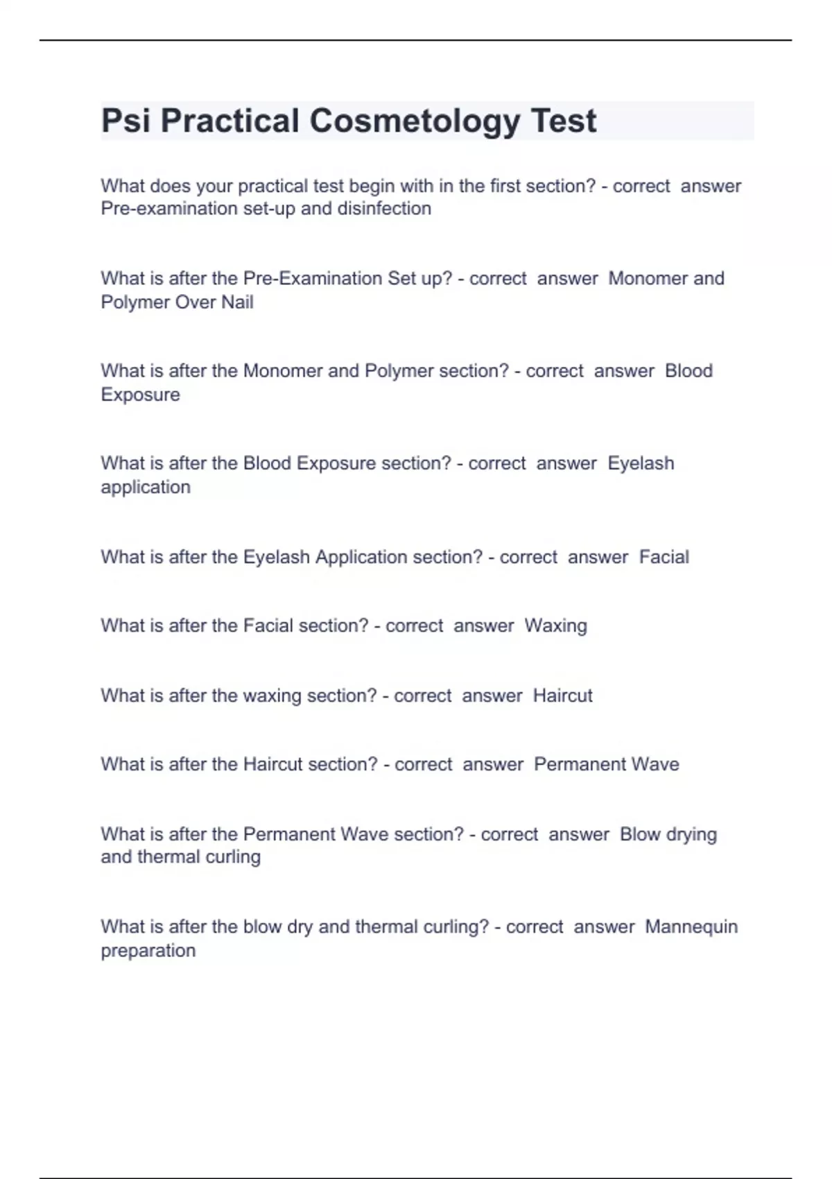 Psi Practical Cosmetology Test Question and answer 2024 verified to passWhat does your practical test begin with in the first section? - correct answer Pre-examination set-up and disinfection What is after the Pre-Examination Set up? - correct answer Monomer and Polymer Over Nail What is after the Monomer and Polymer section? - correct answer Blood Exposure What is after the Blood Exposure section? - correct answer Eyelash application What is after the Eyelash Application section? - correct answer Facial What is after the Facial section? - correct answer Waxing