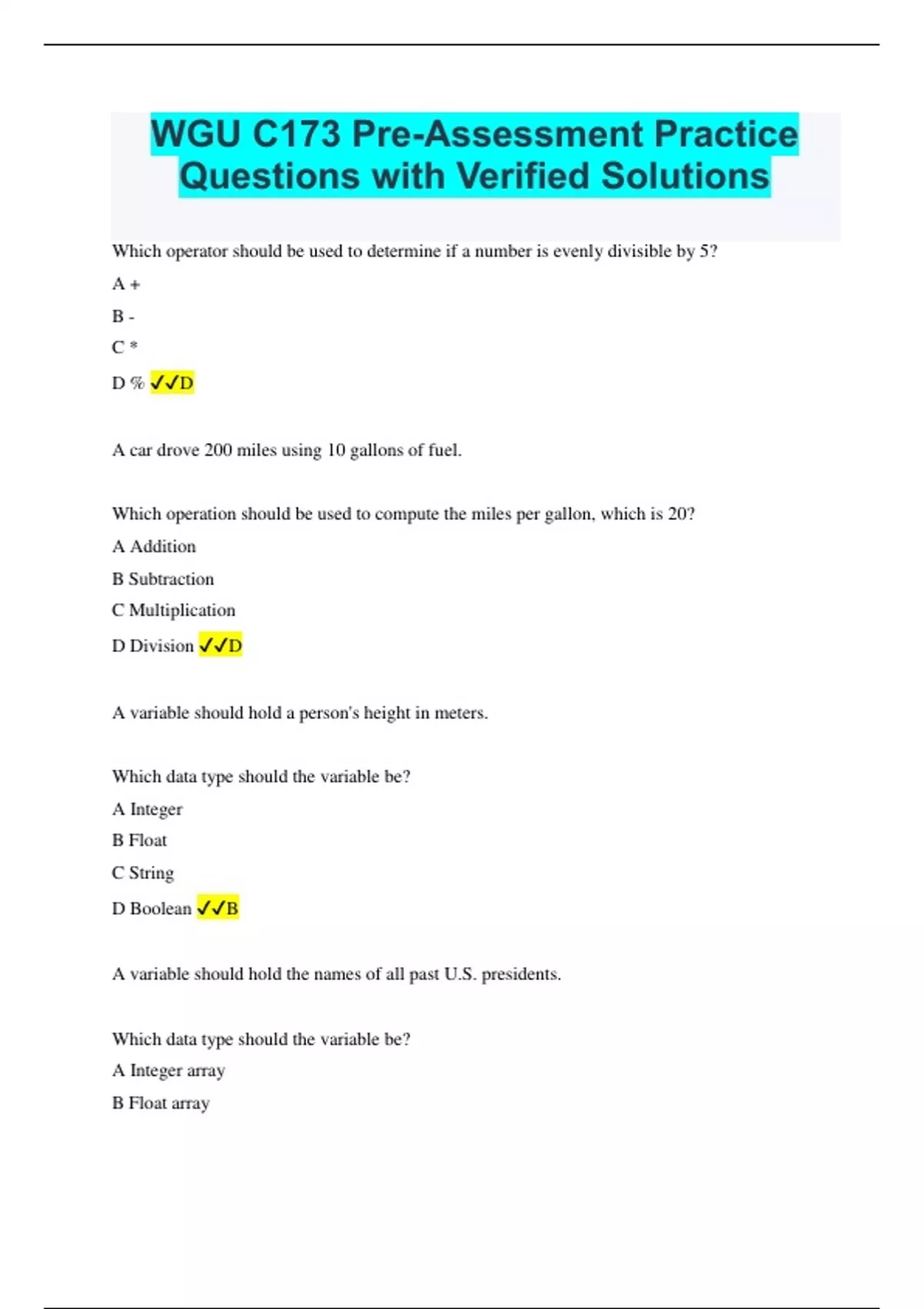 WGU C173 Pre-Assessment Practice Questions with Verified Solutions Which operator should be used to determine if a number is evenly divisible by 5? A + B - C * D % D A car drove 200 miles using 10 gallons of fuel. Which operation should be used to compute the miles per gallon, which is 20? A Addition B Subtraction C Multiplication D Division D A variable should hold a person's height in meters. Which data type should the variable be? A Integer B Float C String D Boolean B A variable should hold the names of all past U.S. presidents. Which data type should the variable be? A Integer array B Float arrayC String array D Boolean array C A program uses the number of seconds in a minute in various calculations. How should the item that holds the number of seconds in a minute be declared? A Constant float userTime B Variable float userTime C Constant integer secondsPerMinute D Variable integer secondsPerMinute C A program determines if a user's age is high enough to run for U.S. president. The minimum age requirement is 35. How should the item that holds the minimum age be declared? A Constant integer minAge B Variable integer minAge C Constant integer 35 D Variable integer 35 A Given integer x = 3 and integer y = 5. What is the value of the expression ( x / 2.0) + y? A 5.0 B 6.0 C 6.5 7 7.5 C Given float x = 10.2 and float y = 1.0. What is the value of the expression x / y ? A 0.0