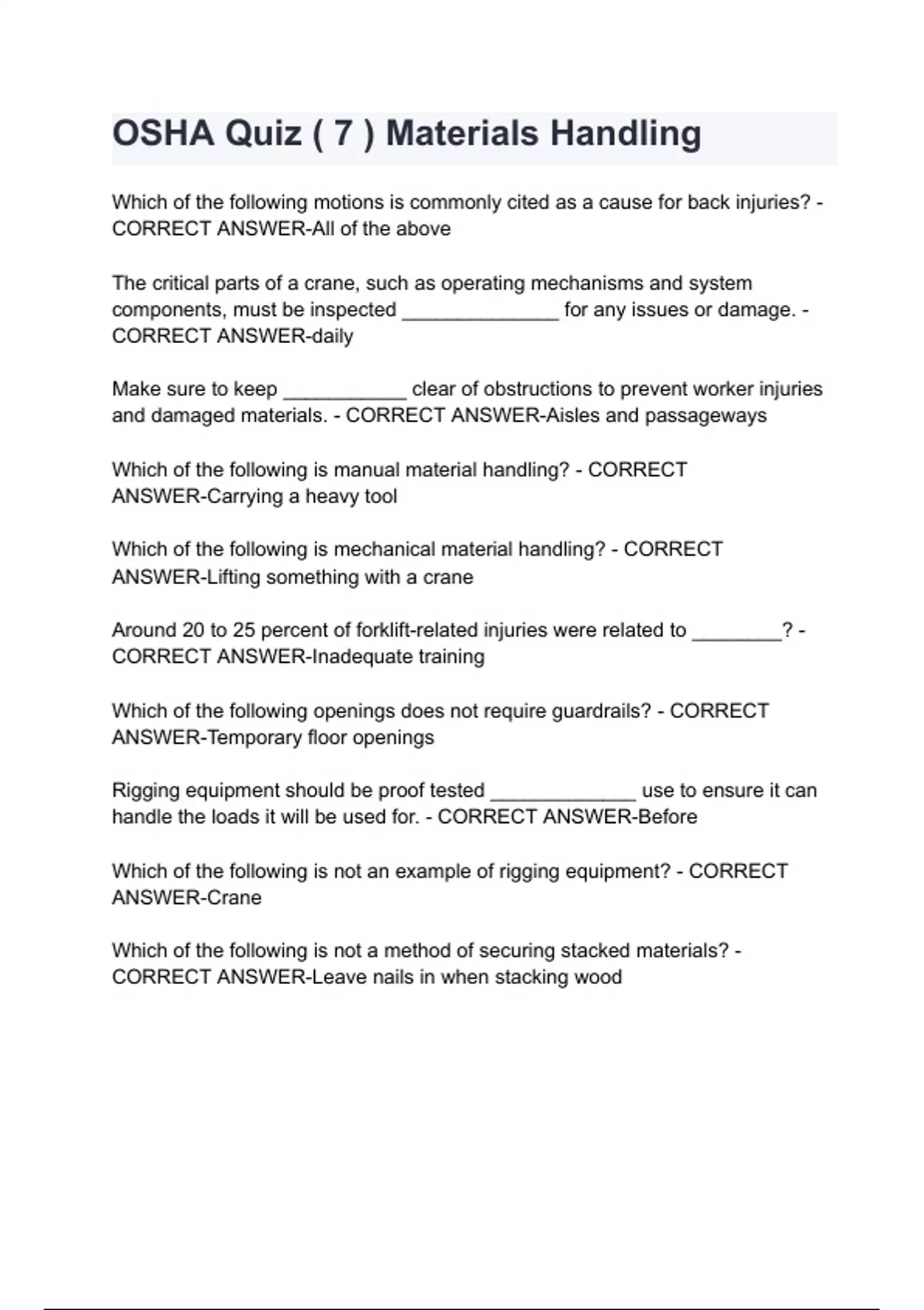 OSHA Quiz ( 7 ) Materials Handling Which of the following motions is commonly cited as a cause for back injuries? - CORRECT ANSWER-All of the above The critical parts of a crane, such as operating mechanisms and system components, must be inspected ______________ for any issues or damage. - CORRECT ANSWER-daily Make sure to keep ___________ clear of obstructions to prevent worker injuries and damaged materials. - CORRECT ANSWER-Aisles and passageways Which of the following is manual material handling? - CORRECT ANSWER-Carrying a heavy tool Which of the following is mechanical material handling? - CORRECT ANSWER-Lifting something with a crane Around 20 to 25 percent of forklift-related injuries were related to ________? - CORRECT ANSWER-Inadequate training Which of the following openings does not require guardrails? - CORRECT ANSWER-Temporary floor openings Rigging equipment should be proof tested _____________ use to ensure it can handle the loads it will be used for. - CORRECT ANSWER-Before Which of the following is not an example of rigging equipment? - CORRECT ANSWER-Crane Which of the following is n