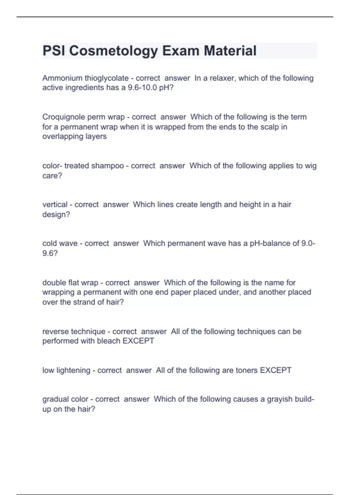 PSI Cosmetology Exam Material Question and answers correctly solved 2024 Ammonium thioglycolate - correct answer In a relaxer, which of the following active ingredients has a 9.6-10.0 pH? Croquignole perm wrap - correct answer Which of the following is the term for a permanent wrap when it is wrapped from the ends to the scalp in overlapping layers color- treated shampoo - correct answer Which of the following applies to wig care? vertical - correct answer Which lines create length and height in a hair design? cold wave - correct answer Which permanent wave has a pH-balance of 9.0-9.6? double flat wrap - correct answer Which of the following is the name for wrapping a permanent with one end paper placed under, and another placed over the strand of hair? reverse technique - correct answer All of the following techniques can be performed with bleach EXCEPT low lightening - correct answer All of the following are toners EXCEPT gradual color - correct answer Which of the following causes a grayish build-up on the hair?