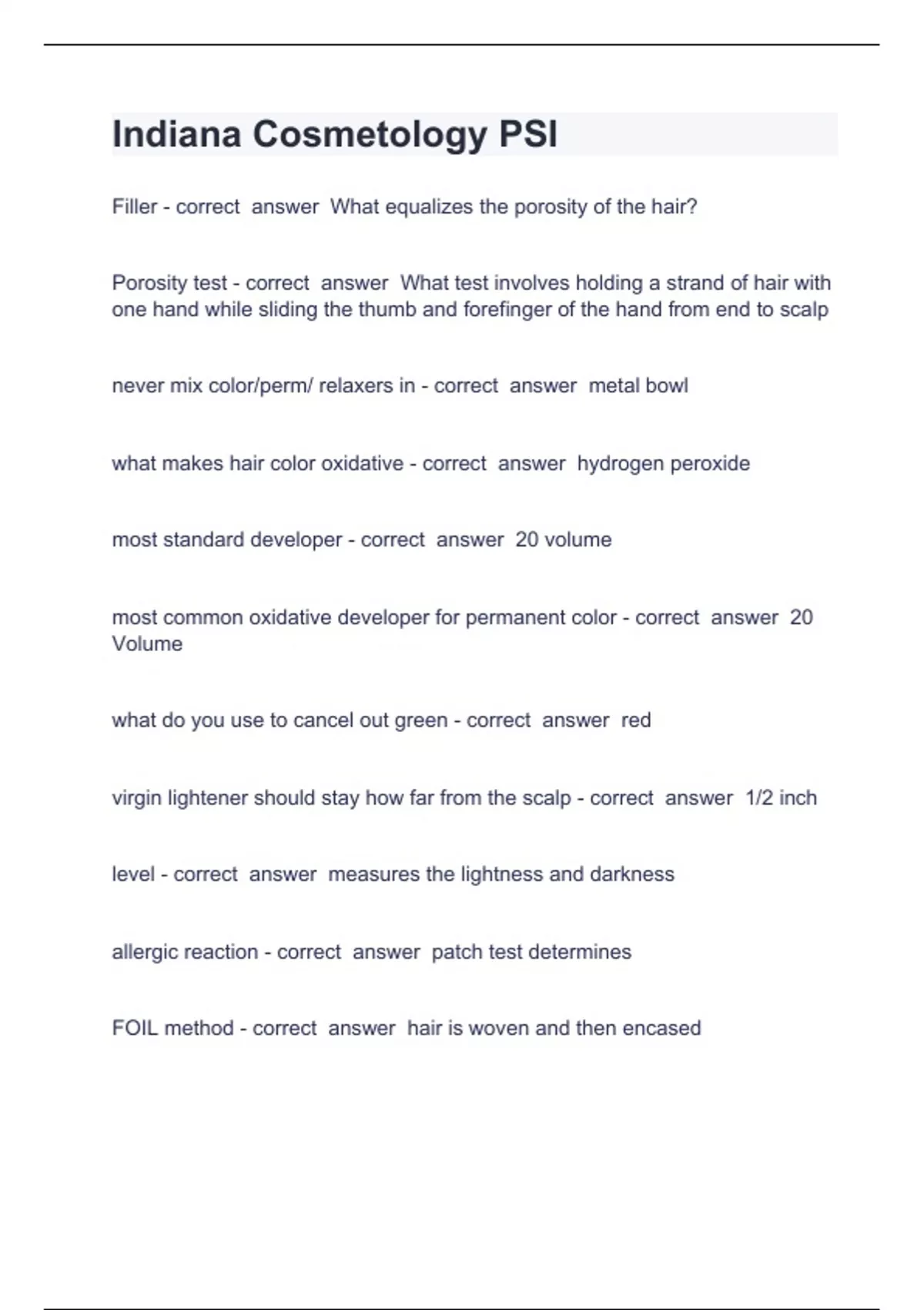 Indiana Cosmetology PSI Question and answers rated A+ 2024 Filler - correct answer What equalizes the porosity of the hair? Porosity test - correct answer What test involves holding a strand of hair with one hand while sliding the thumb and forefinger of the hand from end to scalp never mix color/perm/ relaxers in - correct answer metal bowl what makes hair color oxidative - correct answer hydrogen peroxide most standard developer - correct answer 20 volume most common oxidative developer for permanent color - correct answer 20 Volume