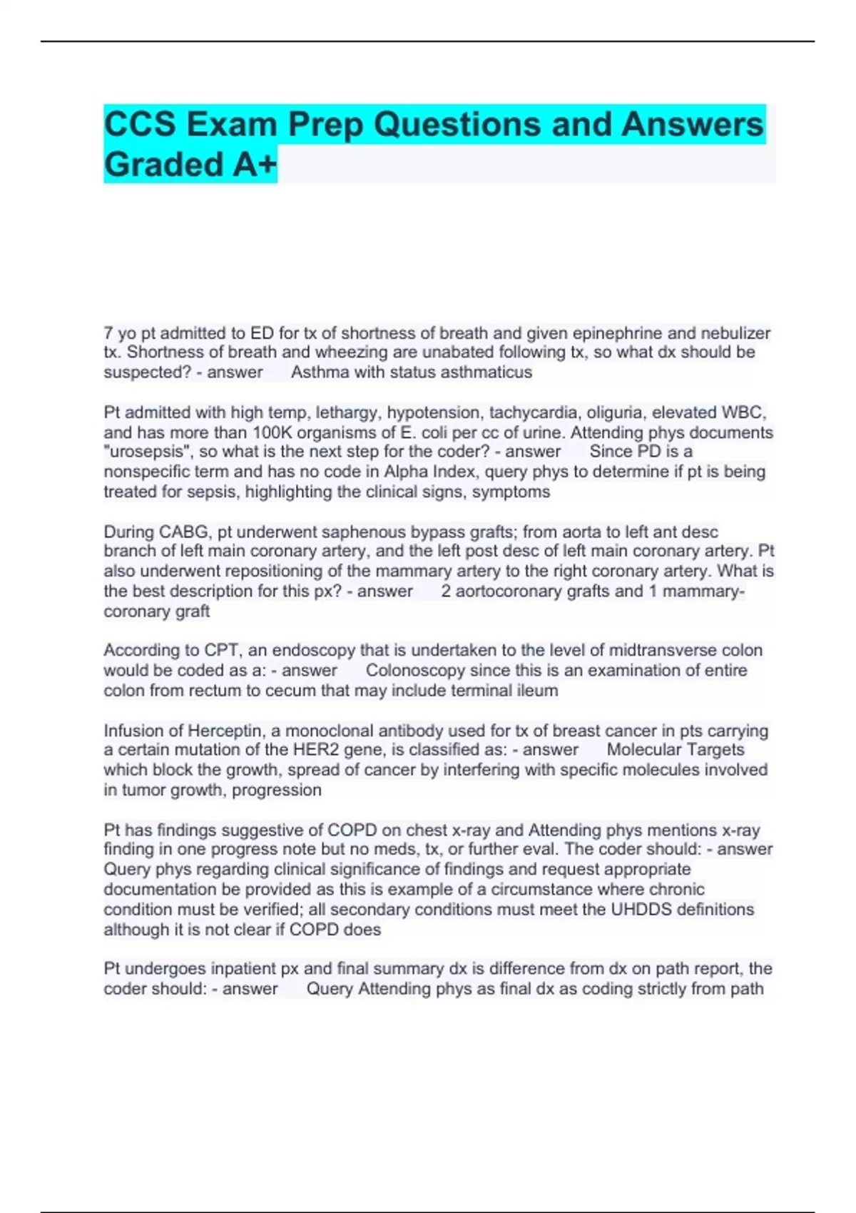 CCS Exam Prep Questions and Answers Graded A+ 7 yo pt admitted to ED for tx of shortness of breath and given epinephrine and nebulizer tx. Shortness of breath and wheezing are unabated following tx, so what dx should be suspected? Asthma with status asthmaticus Pt admitted with high temp, lethargy, hypotension, tachycardia, oliguria, elevated WBC, and has more than 100K organisms of E. coli per cc of urine. Attending phys documents "urosepsis", so what is the next step for the coder? Since PD is a nonspecific term and has no code in Alpha Index, query phys to determine if pt is being treated for sepsis, highlighting the clinical signs, symptoms During CABG, pt underwent saphenous bypass grafts; from aorta to left ant desc branch of left main coronary artery, and the left post desc of left main coronary artery. Pt also underwent repositioning of the mammary artery to the right coronary artery. What is the best description for this px? 2 aortocoronary grafts and 1 mammary-coronary graft According to CPT, an endoscopy that is undertaken to the level of midtransverse colon would be coded as a: Colonoscopy since this is an examination of entire colon from rectum to cecum that may include terminal ileum Infusion of Herceptin, a monoclonal antibody used for tx of breast cancer in pts carrying a certain mutation of the HER2 gene, is classified as: Molecular Targets which block the growth, spread of cancer by interfering with specific molecules involved in tumor growth, progression Pt has findings suggestive of COPD on chest x-ray and Attending phys mentions x-ray finding in one progress note but no meds, tx, or further eval. The coder should: Query phys regarding clinical significance of findings and request appropriate documentation be provided as this is example of a circumstance where chronic condition must be verified; all secondary conditions must meet the UHDDS definitions although it is not clear if COPD does Pt undergoes inpatient px and final summary dx is difference from dx on path report, the coder should: Query Attending phys as final dx as coding strictly from path report is not appropriate since coder would be assigning dx without Attending phys' corroboration 56 yo woman admitted to acute-care facility from SNF and has multiple sclerosis and hypertension. During course of hospitalization, decubitus ulcer is found and debrided at bedside by phys. There is no typed op report and no path report. The coder should: Query healthcare provider who performed px to determine if debridement was excisional as coders are encouraged to work with physicians, healthcare providers to ensure documentation is very specific and clarified 23 yo female admitted for shock following tx of miscarriage and path report from prev admit reveals pt had no decidua or POC in tissue removed. Encounter would be coded as: O08.9 = complication following abortion and ectopic and molar pregnancies since miscarriage was dealt with in a prior episode of care Most hospitals require a medical record is completed within: 30 days due to Medicare CofP and TJC To correct an entry in the MR, the provider should: Draw single line through the error, add a note explaining the error, initial, date, and add correct info in chronological order After pt is discharged from hospital, the MR must be reviewed for: Certain basic reports such as history and physical, discharge summary, etc. Pt is discharged with diagnosis of acute pulmonary edema due to CHF so what cn(s) should be coded? CHF Pt is admitted for chest pain, was stabilized and discharged. In subsequent adm, pt was admitted an outpt for left heart catheterization, coronary arteriography using 2 catheters, left ventricular angiography, and found to have arteriosclerotic heart disease. Pt has no hx of cardiac surgery. What is the proper sequencing of ICD-10-CM and CPT codes for outpt catheterization? I25.10 (Atherosclerotic heart disease of native coronary artery without angina pectoris) 93458 (Catheter placement in coronary artery(s) for coronary angiography, incl intraprocedural injection(s) for coronary angiography, imaging supervision and interpretation with left heart catheterization including intraprocedural injection(s) for left ventriculography, when performed 65yo pt adm w/pain and loosening of left total hip prosthesis along with the loosening of the acetabular component which has become painful. Pt ad for open removal/replacement of acetabular component of left hip prosthesis, so what is the correct coding for admission? T84.031A (mechanical loosening of int lt hip prosth jt, initial enc 0SPB0JZ (removal synthetic sub fro lt hip jt, open approach 0SRE0JZ (replacement lt hip jt, acetabular surface w/synthetic sub, open approach) Maternity pt adm in labor at 43 wks and has normal delivery with vacuum extraction to facilitate baby's delivery. What is the PD? O48.1 (prolonged pg) With regard to implementation of ICD-10-CM, all of these are correct: ICD-10-CM was developed by NCHS; it was implemented on 10/1/15; was already being used by death certificate coding in US; the process of adopting ICD-10-CM is specified in HIPAA What does NCHS stand for? National Center for Health Statistics 75yo female was adm for AMI and underwent a diagnostic cardiac cath. Following the cath, pt dev a thrombophlebitis documented as due to the catheter in the common femoral artery. The thrombophlebitis would be coded as: T81.718A, complication of other artery following a procedure, NEC, initial enc Pt adm to ED w/chest pain, and dx w/abort MI w/acute myocardial ischemia with no prior cardiac surgery, and normal cardiac enzymes. What is coding for this case? I24.0 (acute coronary thrombosis not resulting in MI) Pts w/acute ischemic heart disease or acute myocardial ischemia do not always indicate an infarction and it is often possible to prevent infarction by means of surgery or use of thrombolytic agents if tx promptly Pt has nausea, vomiting, abdominal pain due to acute cholecystitis. Phys d