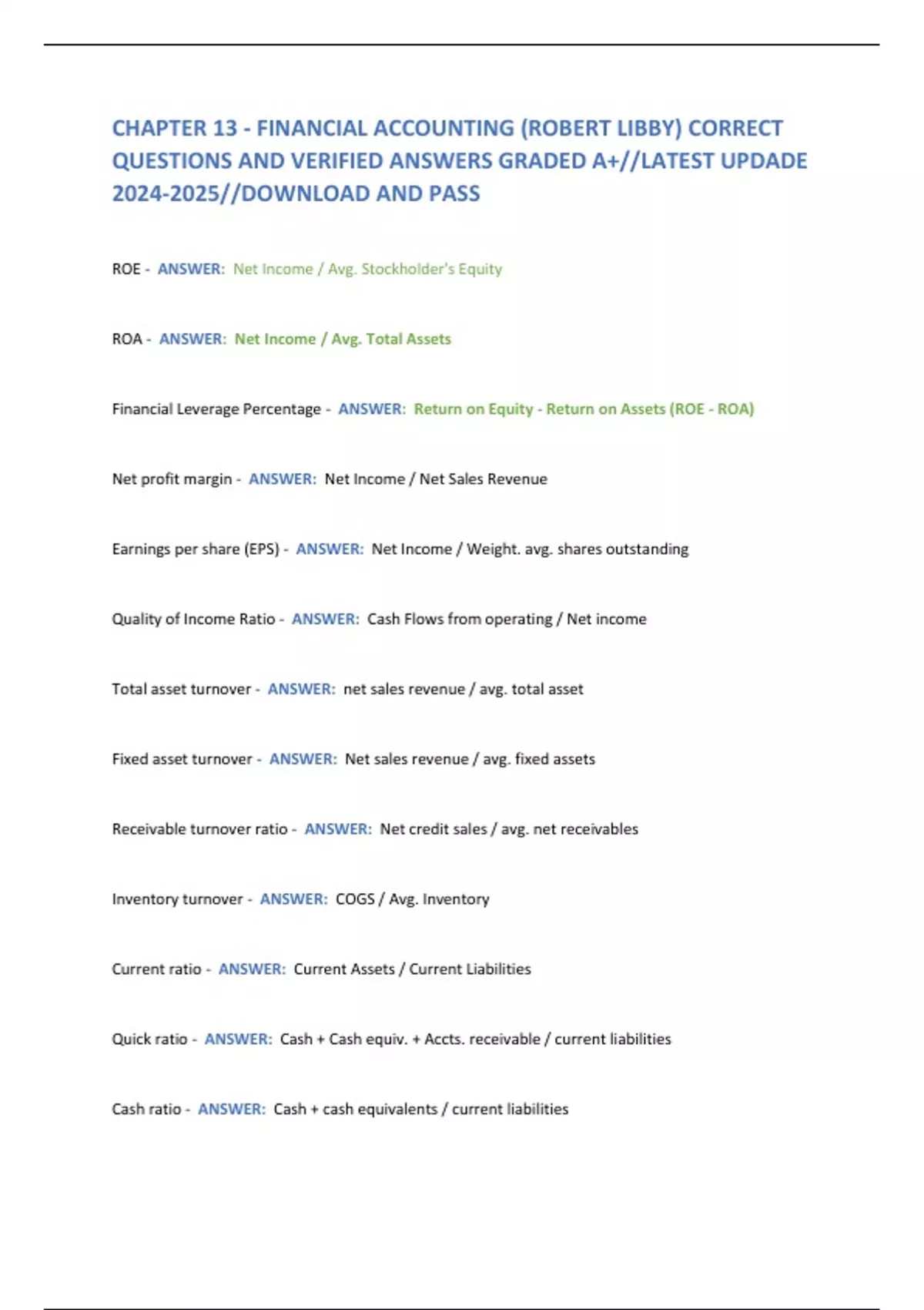 ROE - ANSWER: Net Income / Avg. Stockholder's Equity