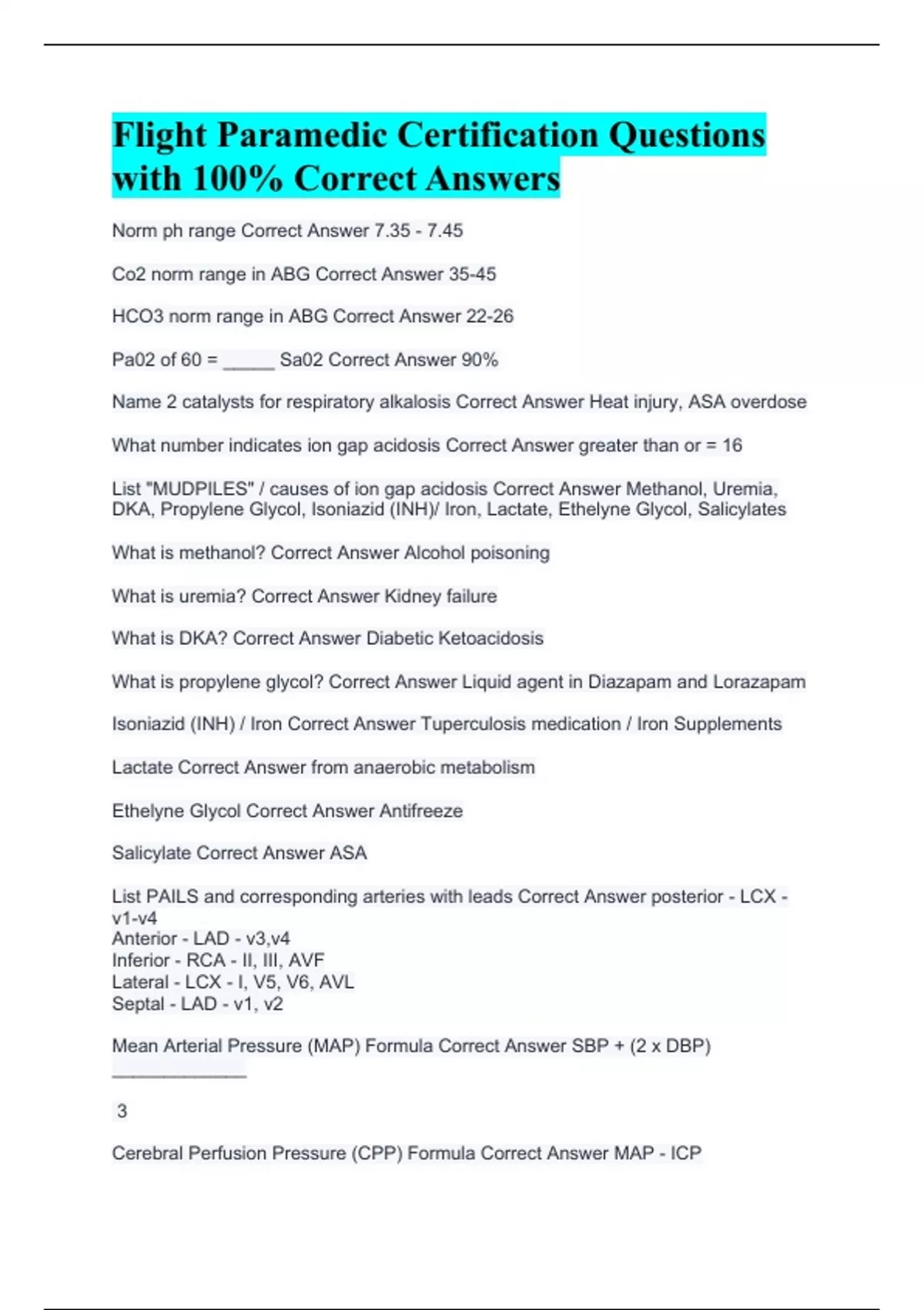 Norm ph range Correct Answer 7.35 - 7.45 Co2 norm range in ABG Correct Answer 35-45 HCO3 norm range in ABG Correct Answer 22-26 Pa02 of 60 = _____ Sa02 Correct Answer 90% Name 2 catalysts for respiratory alkalosis Correct Answer Heat injury, ASA overdose What number indicates ion gap acidosis Correct Answer greater than or = 16 List "MUDPILES" / causes of ion gap acidosis Correct Answer Methanol, Uremia, DKA, Propylene Glycol, Isoniazid (INH)/ Iron, Lactate, Ethelyne Glycol, Salicylates What is methanol? Correct Answer Alcohol poisoning What is uremia? Correct Answer Kidney failure What is DKA? Correct Answer Diabetic Ketoacidosis What is propylene glycol? Correct Answer Liquid agent in Diazapam and Lorazapam Isoniazid (INH) / Iron Correct Answer Tuperculosis medication / Iron Supplements Lactate Correct Answer from anaerobic metabolism Ethelyne Glycol Correct Answer Antifreeze Salicylate Correct Answer ASA List PAILS and corresponding arteries with leads Correct Answer posterior - LCX - v1-v4 Anterior - LAD - v3,v4 Inferior - RCA - II, III, AVF Lateral - LCX - I, V5, V6, AVL Septal - LAD - v1, v2 Mean Arterial Pressure (MAP) Formula Correct Answer SBP + (2 x DBP) _____________ 3 Cerebral Perfusion Pressure (CPP) Formula Correct Answer MAP - ICP