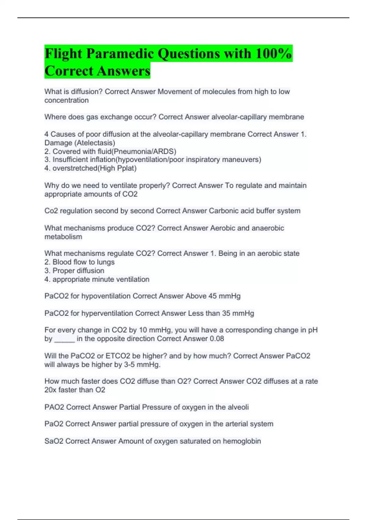 What is diffusion? Correct Answer Movement of molecules from high to low concentration Where does gas exchange occur? Correct Answer alveolar-capillary membrane 4 Causes of poor diffusion at the alveolar-capillary membrane Correct Answer 1. Damage (Atelectasis) 2. Covered with fluid(Pneumonia/ARDS) 3. Insufficient inflation(hypoventilation/poor inspiratory maneuvers) 4. overstretched(High Pplat) Why do we need to ventilate properly? Correct Answer To regulate and maintain appropriate amounts of CO2 Co2 regulation second by second Correct Answer Carbonic acid buffer system What mechanisms produce CO2? Correct Answer Aerobic and anaerobic metabolism What mechanisms regulate CO2? Correct Answer 1. Being in an aerobic state 2. Blood flow to lungs 3. Proper diffusion 4. appropriate minute ventilation PaCO2 for hypoventilation Correct Answer Above 45 mmHg PaCO2 for hyperventilation Correct Answer Less than 35 mmHg For every change in CO2 by 10 mmHg, you will have a corresponding change in pH by _____ in the opposite direction Correct Answer 0.08 Will the PaCO2 or ETCO2 be higher? and by how much? Correct Answer PaCO2 will always be higher by 3-5 mmHg. How much faster does CO2 diffuse than O2? Correct Answer CO2 diffuses at a rate 20x faster than O2 PAO2 Correct Answer Partial Pressure of oxygen in the alveoli PaO2 Correct Answer partial pressure of oxygen in the arterial system SaO2 Correct Answer Amount of oxygen saturated on hemoglobin