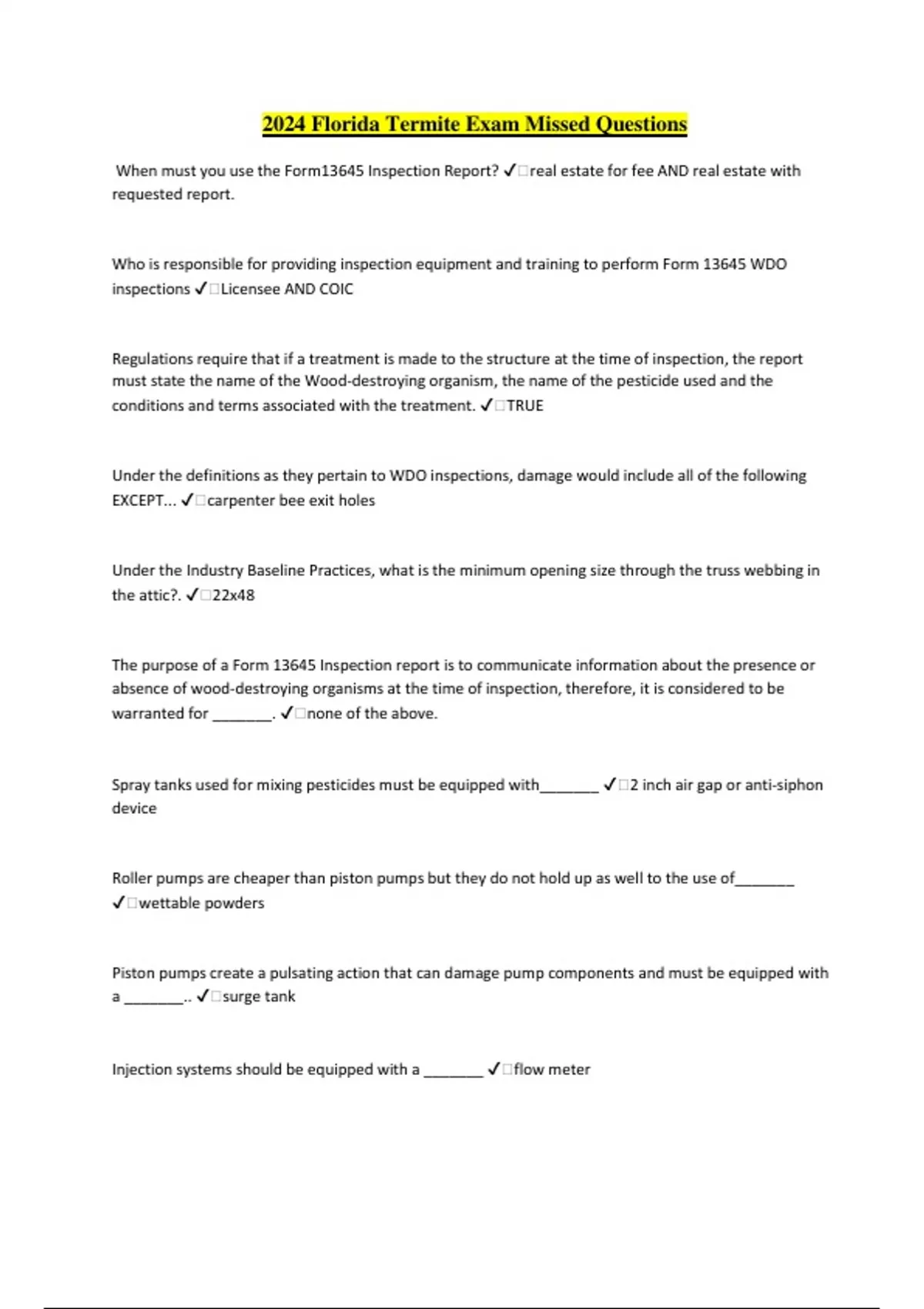 2024 Florida Termite Exam Missed Questions When must you use the Form13645 Inspection Report? ️real estate for fee AND real estate with requested report. Who is responsible for providing inspection equipment and training to perform Form 13645 WDO inspections ️Licensee AND COIC Regulations require that if a treatment is made to the structure at the time of inspection, the report must state the name of the Wood-destroying organism, the name of the pesticide used and the conditions and terms associated with the treatment. ️TRUE Under the definitions as they pertain to WDO inspections, damage would include all of the following EXCEPT... ️carpenter bee exit holes Under the Industry Baseline Practices, what is the minimum opening size through the truss webbing in the attic?. ️22x48 The purpose of a Form 13645 Inspection report is to communicate information about the presence or absence of wood-destroying organisms at the time of inspection, therefore, it is considered to be warranted for _______. ️none of the above. Spray tanks used for mixing pesticides must be equipped with_______ ️2 inch air gap or anti-siphon device Roller pumps are cheaper than piston pumps but they do not hold up as well to the use of_______ ️wettable powders Piston pumps create a pulsating action that can damage pump components and must be equipped with a _______.. ️surge tank Injection systems should be equipped with a _______ ️flow meter Hoses used for termite applications should be made from_______ ️polyvinyl chloride (PVC) Which application system injects metered amounts of termiticide through the surface of the soil without the need for trenching. ️BASF injector system Which Florida Statute listed below is considered the Structural Pest Control Act?... ️Chapter 482 All pesticides used in the United States must be registered by______. ️us environmental protection agency In Florida, which of the following statutory chapters covers the pesticide storage facility?. ️chapter 252 Which of the following Florida Administrative Code chapter(s),referred to as the "Rules", interprets Chapter 482, Florida Statutes?... ️chapter 5e- 14 In Florida, the definition of pest control includes the use of any method or device or the application of any substance to_______... ️both A and C (prevent, destroy, repel...any pest AND use of any economic poison or mechanical device); Which of the following Bureaus, within the Florida Department of Agriculture and Consumer Services, regulates the pest control industry?... ️Bureau of Inspections and Incident Response; Which of the following are used to define a "Certified Operator in Charge"?.. ️All of the above In Florida, the definition of wood-destroying organism includes all of the following EXCEPT_______... ️ambrosia beetles In Florida, which statutory chapter regulates waste management and pesticide container burning