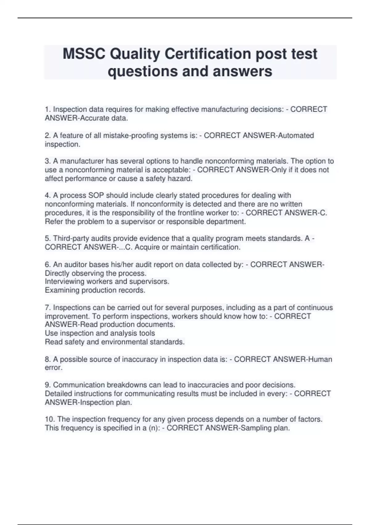 MSSC Quality Certification post test questions and answers 1. Inspection data requires for making effective manufacturing decisions: - CORRECT ANSWER-Accurate data. 2. A feature of all mistake-proofing systems is: - CORRECT ANSWER-Automated inspection. 3. A manufacturer has several options to handle nonconforming materials. The option to use a nonconforming material is acceptable: - CORRECT ANSWER-Only if it does not affect performance or cause a safety hazard. 4. A process SOP should include clearly stated procedures for dealing with nonconforming materials. If nonconformity is detected and there are no written procedures, it is the responsibility of the frontline worker to: - CORRECT ANSWER-C. Refer the problem to a supervisor or responsible department. 5. Third-party audits provide evidence that a quality program meets standards. A - CORRECT ANSWER-...C. Acquire or maintain certification. 6. An auditor bases his/her audit report on data collected by: - CORRECT ANSWERDirectly observing the process. Interviewing workers and supervisors. Examining production records. 7. Inspections can be carried out for several purposes, including as a part of continuous improvement. To perform inspections, workers should know how to: - CORRECT ANSWER-Read production documents. Use inspection and analysis tools Read safety and environmental standards. 8. A possible source of inaccuracy in inspection data is: - CORRECT ANSWER-Human error. 9. Communication breakdowns can lead to inaccuracies and poor decisions. Detailed instructions for communicating results must be included in every: - CORRECT ANSWER-Inspection plan. 10. The inspection frequency for any given process depends on a number of factors. This frequency is specified in a (n): - CORRECT ANSWER-Sampling plan. 11. The main purpose of inspecting the final product is: - CORRECT ANSWER-Product acceptance. 12. Many products require, a record of a material's history. This record is known as the product's: - CORRECT ANSWER-Traceability. 13. In some cases, nonconforming goods are shipped to a customer if the customer waives the specification. When this happens, workers should: - CORRECT ANSWERBe aware that the shipment is an exception. 14. Many inspections are performed by frontline workers. Quality management systems require that the company: - CORRECT ANSWER-Provide training of proper procedures for testing. Include training in health, safety, and environmental procedures. Keep complete documentation of all training. 15. The purpose of a quality audit is to: - CORRECT ANSWER-Provide assurance that the process follows the guidelines of the quality plan. 16. The three types of quality audits are: - CORRECT ANSWER-Internal, external, and third-party. 17. An audit report is always presented to the person or organization requesting the audit. A summary of each discrepancy from standards should also be available to: - CORRECT ANSWER-Production workers involved in the process. 18. What documentation is required for "first piece" inspections? - CORRECT ANSWER-D. In-process form