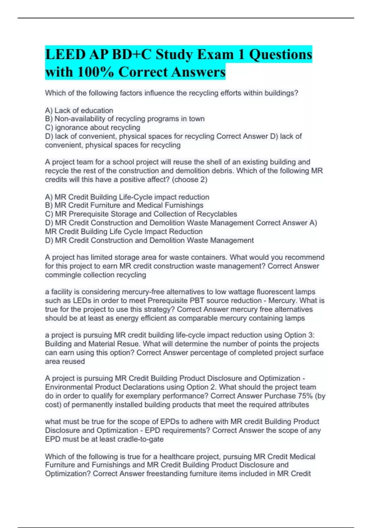 Which of the following factors influence the recycling efforts within buildings? A) Lack of education B) Non-availability of recycling programs in town C) ignorance about recycling D) lack of convenient, physical spaces for recycling Correct Answer D) lack of convenient, physical spaces for recycling A project team for a school project will reuse the shell of an existing building and recycle the rest of the construction and demolition debris. Which of the following MR credits will this have a positive affect? (choose 2) A) MR Credit Building Life-Cycle impact reduction B) MR Credit Furniture and Medical Furnishings C) MR Prerequisite Storage and Collection of Recyclables D) MR Credit Construction and Demolition Waste Management Correct Answer A) MR Credit Building Life Cycle Impact Reduction D) MR Credit Construction and Demolition Waste Management A project has limited storage area for waste containers. What would you recommend for this project to earn MR credit construction waste management? Correct Answer commingle collection recycling a facility is considering mercury-free alternatives to low wattage fluorescent lamps such as LEDs in order to meet Prerequisite PBT source reduction - Mercury. What is true for the project to use this strategy? Correct Answer mercury free alternatives should be at least as energy efficient as comparable mercury containing lamps a project is pursuing MR credit building life-cycle impact reduction using Option 3: Building and Material Resue. What will determine the number of points the projects can earn using this option? Correct Answer percentage of completed project surface area reused A project is pursuing MR Credit Building Product Disclosure and Optimization - Environmental Product Declarations using Option 2. What should the project team do in order to qualify for exemplary performance? Correct Answer Purchase 75% (by cost) of permanently installed building products that meet the required attributes what must be true for the scope of EPDs to adhere with MR credit Building Product Disclosure and Optimization - EPD requirements? Correct Answer the scope of any EPD must be at least cradle-to-gate Which of the following is true for a healthcare project, pursuing MR Credit Medical Furniture and Furnishings and MR Credit Building Product Disclosure and Optimization? Correct Answer freestanding furniture items included in MR Credit