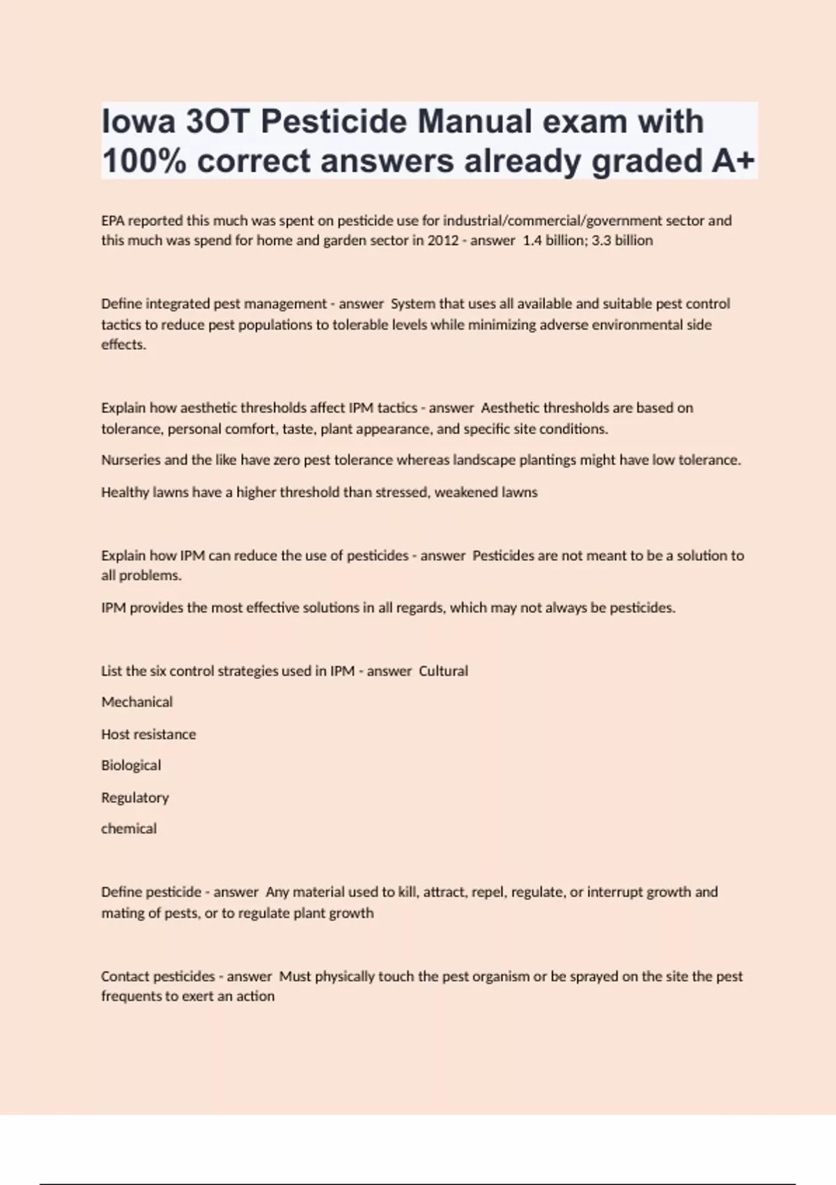 Iowa 3OT Pesticide Manual exam with 100% correct answers already graded A+