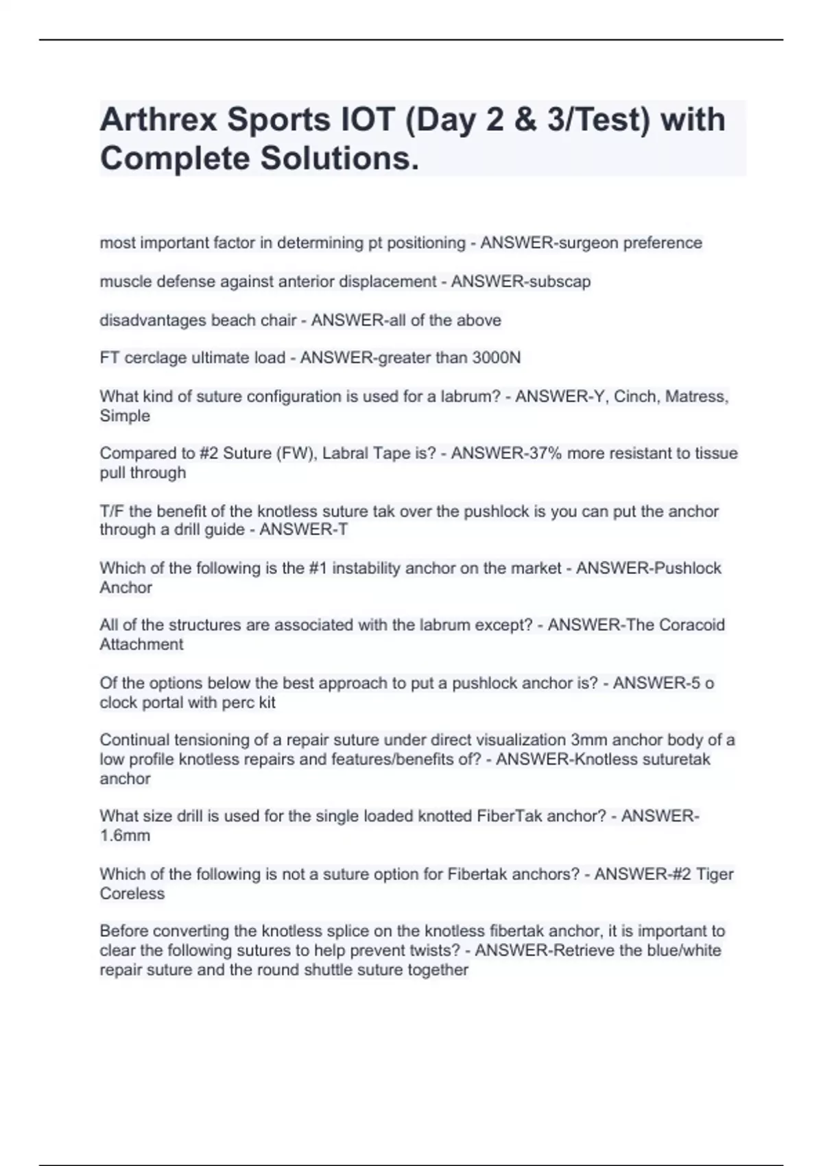 most important factor in determining pt positioning - ANSWER-surgeon preference muscle defense against anterior displacement - ANSWER-subscap disadvantages beach chair - ANSWER-all of the above FT cerclage ultimate load - ANSWER-greater than 3000N What kind of suture configuration is used for a labrum? - ANSWER-Y, Cinch, Matress, Simple Compared to #2 Suture (FW), Labral Tape is? - ANSWER-37% more resistant to tissue pull through T/F the benefit of the knotless suture tak over the pushlock is you can put the anchor through a drill guide - ANSWER-T Which of the following is the #1 instability anchor on the market - ANSWER-Pushlock Anchor All of the structures are associated with the labrum except? - ANSWER-The Coracoid Attachment Of the options below the best approach to put a pushlock anchor is? - ANSWER-5 o clock portal with perc kit Continual tensioning of a repair suture under direct visualization 3mm anchor body of a low profile knotless repairs and features/benefits of? - ANSWER-Knotless suturetak anchor What size drill is used for the single loaded knotted FiberTak anchor? - ANSWER-1.6mm Which of the following is not a suture option for Fibertak anchors? - ANSWER-#2 Tiger Coreless Before converting the knotless splice on the knotless fibertak anchor, it is important to clear the following sutures to help prevent twists? - ANSWER-Retrieve the blue/white repair suture and the round shuttle suture together