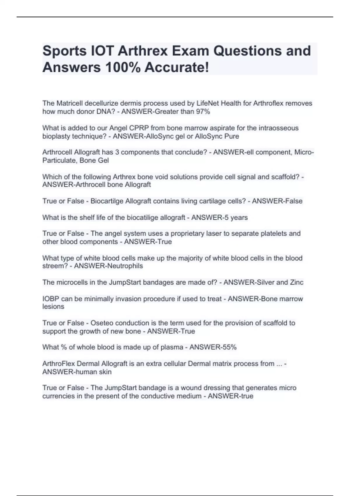 The Matricell decellurize dermis process used by LifeNet Health for Arthroflex removes how much donor DNA? - ANSWER-Greater than 97% What is added to our Angel CPRP from bone marrow aspirate for the intraosseous bioplasty technique? - ANSWER-AlloSync gel or AlloSync Pure Arthrocell Allograft has 3 components that conclude? - ANSWER-ell component, Micro-Particulate, Bone Gel Which of the following Arthrex bone void solutions provide cell signal and scaffold? - ANSWER-Arthrocell bone Allograft True or False - Biocartilge Allograft contains living cartilage cells? - ANSWER-False What is the shelf life of the biocatilige allograft - ANSWER-5 years True or False - The angel system uses a proprietary laser to separate platelets and other blood components - ANSWER-True What type of white blood cells make up the majority of white blood cells in the blood streem? - ANSWER-Neutrophils The microcells in the JumpStart bandages are made of? - ANSWER-Silver and Zinc IOBP can be minimally invasion procedure if used to treat - ANSWER-Bone marrow lesions True or False - Oseteo conduction is the term used for the provision of scaffold to support the growth of new bone - ANSWER-True What % of whole blood is made up of plasma - ANSWER-55% ArthroFlex Dermal Allograft is an extra cellular Dermal matrix process from ... - ANSWER-human skin True or False - The JumpStart bandage is a wound dressing that generates micro currencies in the present of the conductive medium - ANSWER-true The GraftNet collector may be used in which of the following procedures? - ANSWER-(All the above) AutoGraft BTB for bone collection, PowerPick/BioCartilige for Cartilige