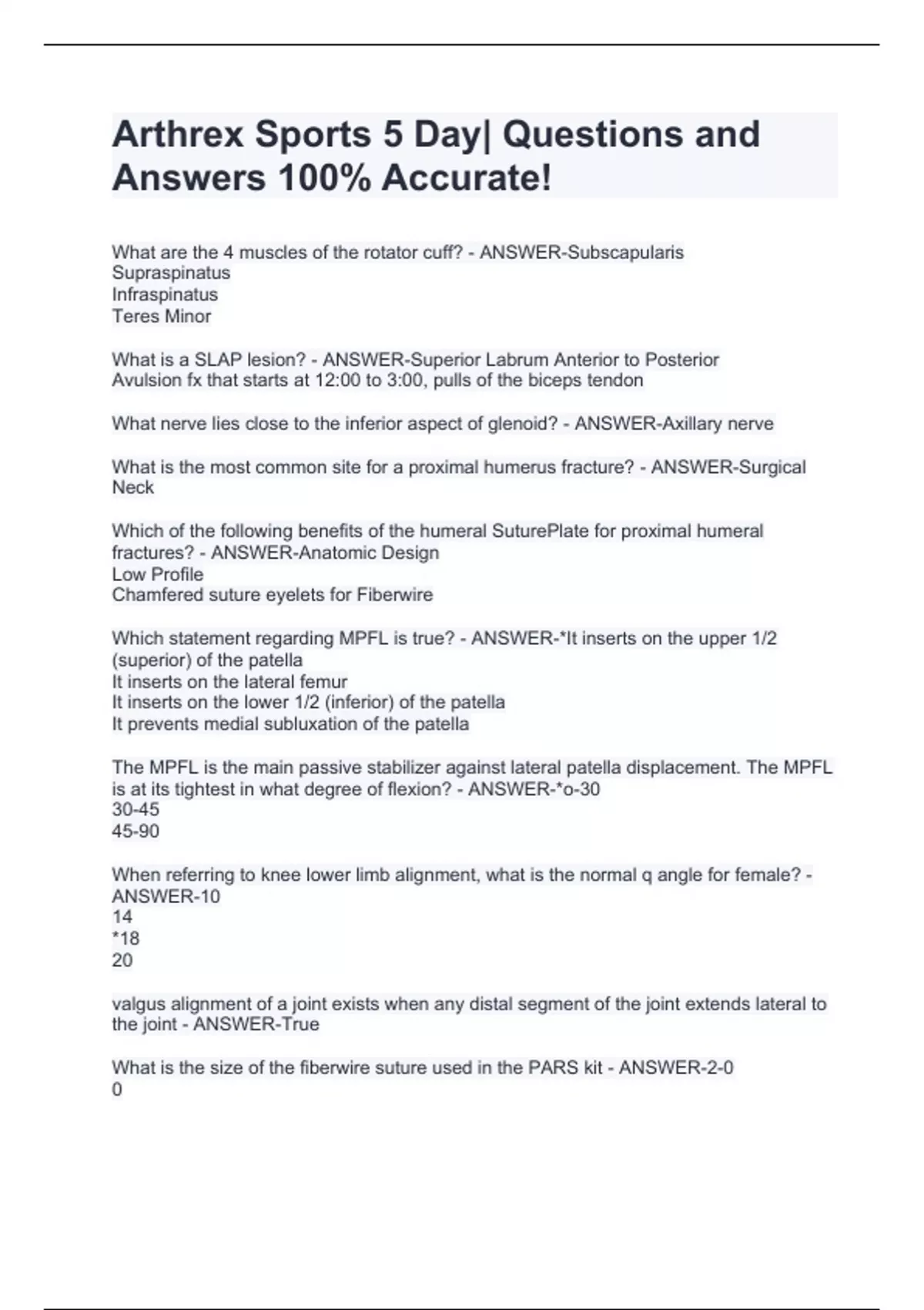 What are the 4 muscles of the rotator cuff? - ANSWER-Subscapularis Supraspinatus Infraspinatus Teres Minor What is a SLAP lesion? - ANSWER-Superior Labrum Anterior to Posterior Avulsion fx that starts at 12:00 to 3:00, pulls of the biceps tendon What nerve lies close to the inferior aspect of glenoid? - ANSWER-Axillary nerve What is the most common site for a proximal humerus fracture? - ANSWER-Surgical Neck Which of the following benefits of the humeral SuturePlate for proximal humeral fractures? - ANSWER-Anatomic Design Low Profile Chamfered suture eyelets for Fiberwire Which statement regarding MPFL is true? - ANSWER-*It inserts on the upper 1/2 (superior) of the patella It inserts on the lateral femur It inserts on the lower 1/2 (inferior) of the patella It prevents medial subluxation of the patella The MPFL is the main passive stabilizer against lateral patella displacement. The MPFL is at its tightest in what degree of flexion? - ANSWER-*o-30 30-45 45-90 When referring to knee lower limb alignment, what is the normal q angle for female? - ANSWER-10 14 *18 20 valgus alignment of a joint exists when any distal segment of the joint extends lateral to the joint - ANSWER-True What is the size of the fiberwire suture used in the PARS kit - ANSWER-2-0 0