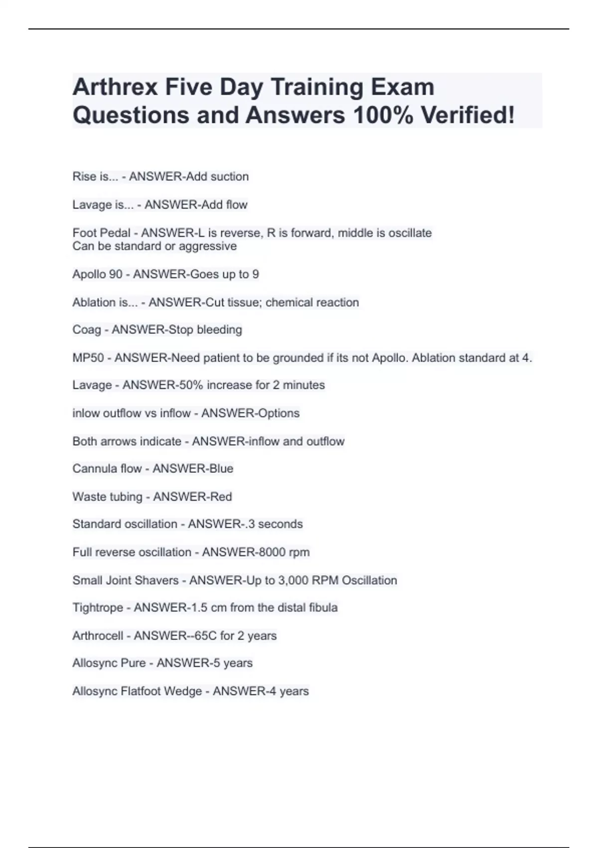 Rise is... - ANSWER-Add suction Lavage is... - ANSWER-Add flow Foot Pedal - ANSWER-L is reverse, R is forward, middle is oscillate Can be standard or aggressive Apollo 90 - ANSWER-Goes up to 9 Ablation is... - ANSWER-Cut tissue; chemical reaction Coag - ANSWER-Stop bleeding MP50 - ANSWER-Need patient to be grounded if its not Apollo. Ablation standard at 4. Lavage - ANSWER-50% increase for 2 minutes inlow outflow vs inflow - ANSWER-Options Both arrows indicate - ANSWER-inflow and outflow Cannula flow - ANSWER-Blue Waste tubing - ANSWER-Red Standard oscillation - ANSWER-.3 seconds Full reverse oscillation - ANSWER-8000 rpm Small Joint Shavers - ANSWER-Up to 3,000 RPM Oscillation Tightrope - ANSWER-1.5 cm from the distal fibula Arthrocell - ANSWER--65C for 2 years Allosync Pure - ANSWER-5 years Allosync Flatfoot Wedge - ANSWER-4 years Amnion - ANSWER-5 years