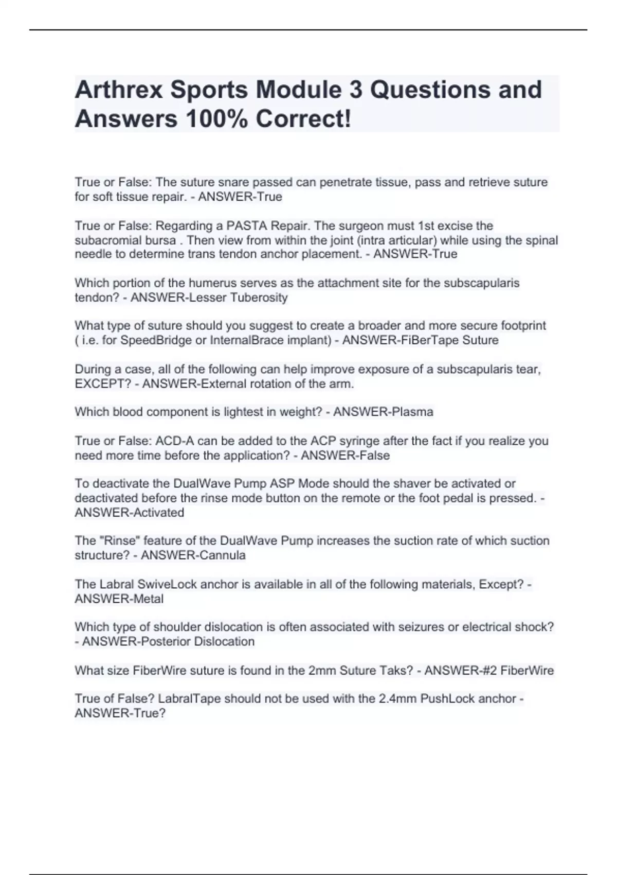 True or False: The suture snare passed can penetrate tissue, pass and retrieve suture for soft tissue repair. - ANSWER-True True or False: Regarding a PASTA Repair. The surgeon must 1st excise the subacromial bursa . Then view from within the joint (intra articular) while using the spinal needle to determine trans tendon anchor placement. - ANSWER-True Which portion of the humerus serves as the attachment site for the subscapularis tendon? - ANSWER-Lesser Tuberosity What type of suture should you suggest to create a broader and more secure footprint ( i.e. for SpeedBridge or InternalBrace implant) - ANSWER-FiBerTape Suture During a case, all of the following can help improve exposure of a subscapularis tear, EXCEPT? - ANSWER-External rotation of the arm. Which blood component is lightest in weight? - ANSWER-Plasma True or False: ACD-A can be added to the ACP syringe after the fact if you realize you need more time before the application? - ANSWER-False To deactivate the DualWave Pump ASP Mode should the shaver be activated or deactivated before the rinse mode button on the remote or the foot pedal is pressed. - ANSWER-Activated The "Rinse" feature of the DualWave Pump increases the suction rate of which suction structure? - ANSWER-Cannula The Labral SwiveLock anchor is available in all of the following materials, Except? - ANSWER-Metal Which type of shoulder dislocation is often associated with seizures or electrical shock? - ANSWER-Posterior Dislocation What size FiberWire suture is found in the 2mm Suture Taks? - ANSWER-#2 FiberWire True of False? LabralTape should not be used with the 2.4mm PushLock anchor - ANSWER-True? The Knotless Suture Tak includes what type of suture? - ANSWER-#2 CoreLess FiberWire True or Fales? The shoulder joint has the most movement of all the joints in the body? - ANSWER-True