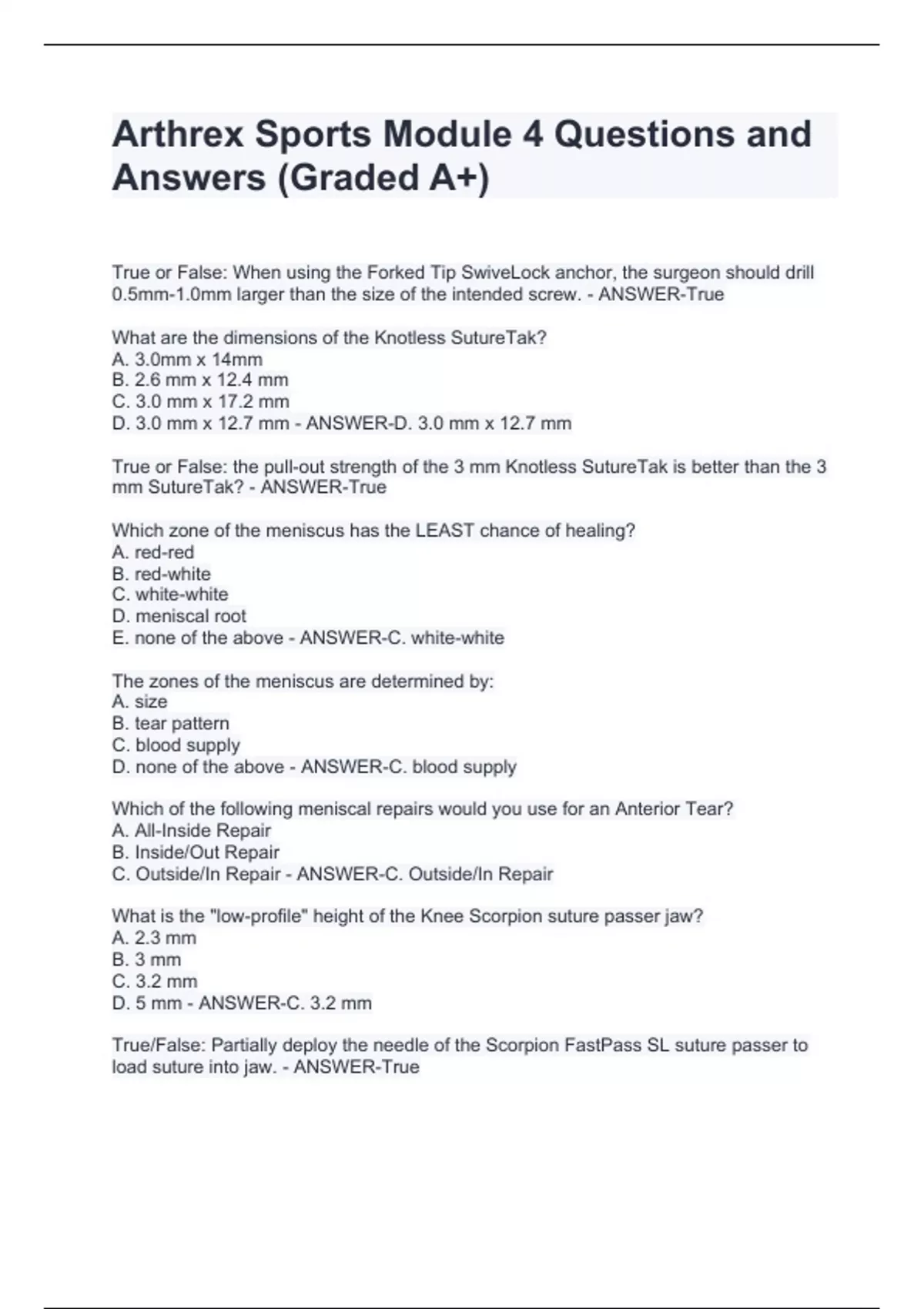 True or False: When using the Forked Tip SwiveLock anchor, the surgeon should drill 0.5mm-1.0mm larger than the size of the intended screw. - ANSWER-True What are the dimensions of the Knotless SutureTak? A. 3.0mm x 14mm B. 2.6 mm x 12.4 mm C. 3.0 mm x 17.2 mm D. 3.0 mm x 12.7 mm - ANSWER-D. 3.0 mm x 12.7 mm True or False: the pull-out strength of the 3 mm Knotless SutureTak is better than the 3 mm SutureTak? - ANSWER-True Which zone of the meniscus has the LEAST chance of healing? A. red-red B. red-white C. white-white D. meniscal root E. none of the above - ANSWER-C. white-white The zones of the meniscus are determined by: A. size B. tear pattern C. blood supply D. none of the above - ANSWER-C. blood supply Which of the following meniscal repairs would you use for an Anterior Tear? A. All-Inside Repair B. Inside/Out Repair C. Outside/In Repair - ANSWER-C. Outside/In Repair What is the "low-profile" height of the Knee Scorpion suture passer jaw? A. 2.3 mm B. 3 mm C. 3.2 mm D. 5 mm - ANSWER-C. 3.2 mm True/False: Partially deploy the needle of the Scorpion FastPass SL suture passer to load suture into jaw. - ANSWER-True What is the angle of the up curve of the Knee Scorpion suture passer's jaw? A. 5 degrees B. 6 degrees C. 8 degrees D. 10 degrees - ANSWER-A. 5 degrees True or False: During the technique for SCR with Knotless SutureTaks, the sutures are passed through the ArthroFLEX dermal allograft in a mattress fashion with the anchors interconnected. - ANSWER-False