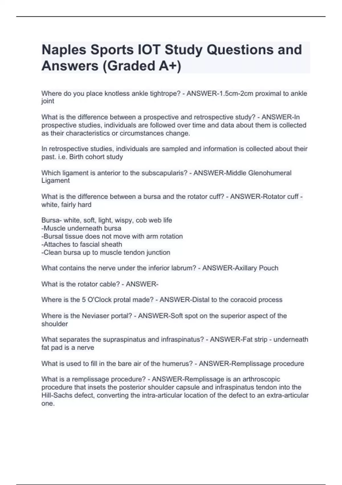 Where do you place knotless ankle tightrope? - ANSWER-1.5cm-2cm proximal to ankle joint What is the difference between a prospective and retrospective study? - ANSWER-In prospective studies, individuals are followed over time and data about them is collected as their characteristics or circumstances change. In retrospective studies, individuals are sampled and information is collected about their past. i.e. Birth cohort study Which ligament is anterior to the subscapularis? - ANSWER-Middle Glenohumeral Ligament What is the difference between a bursa and the rotator cuff? - ANSWER-Rotator cuff - white, fairly hard Bursa- white, soft, light, wispy, cob web life -Muscle underneath bursa -Bursal tissue does not move with arm rotation -Attaches to fascial sheath -Clean bursa up to muscle tendon junction What contains the nerve under the inferior labrum? - ANSWER-Axillary Pouch What is the rotator cable? - ANSWER- Where is the 5 O'Clock protal made? - ANSWER-Distal to the coracoid process Where is the Neviaser portal? - ANSWER-Soft spot on the superior aspect of the shoulder What separates the supraspinatus and infraspinatus? - ANSWER-Fat strip - underneath fat pad is a nerve What is used to fill in the bare air of the humerus? - ANSWER-Remplissage procedure What is a remplissage procedure? - ANSWER-Remplissage is an arthroscopic procedure that insets the posterior shoulder capsule and infraspinatus tendon into the Hill-Sachs defect, converting the intra-articular location of the defect to an extra-articular one. What is a Hill-Sachs lesion? - ANSWER-A Hill-Sachs lesion is a fracture in the long bone in the upper arm (humerus) that connects to the body at the shoulder. You doctor