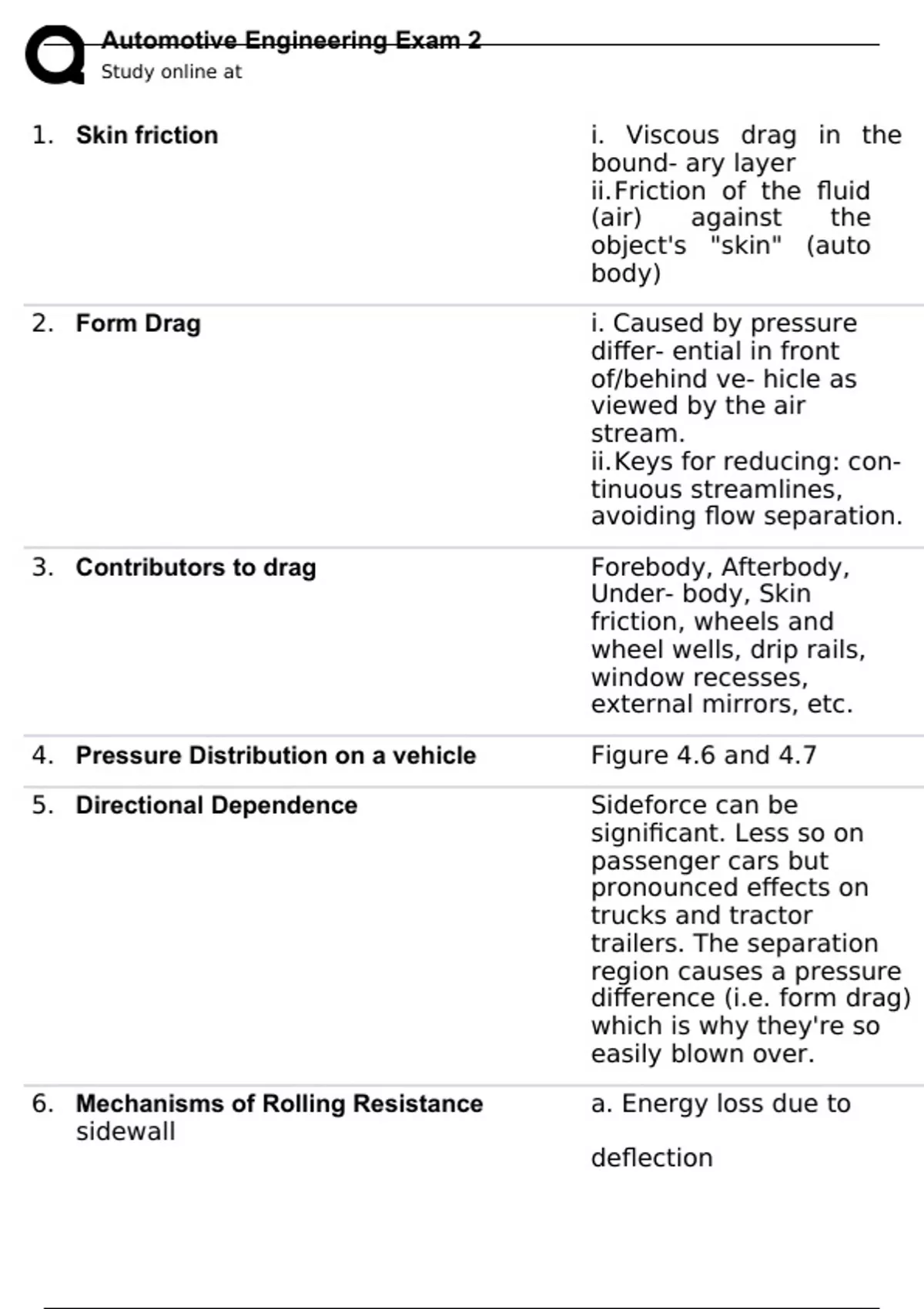 1. Skin friction i. Viscous drag in the bound- ary layer ii. Friction of the fluid (air) against the object's "skin" (auto body) 2. Form Drag i. Caused by pressure differ- ential in front of/behind ve- hicle as viewed by the air stream. ii. Keys for reducing: con- tinuous streamlines, avoiding flow separation. 3. Contributors to drag Forebody, Afterbody, Under- body, Skin friction, wheels and wheel wells, drip rails, window recesses, external mirrors, etc. 4. Pressure Distribution on a vehicle Figure 4.6 and 4.7 5. Directional Dependence Sideforce can be significant. Less so on passenger cars but pronounced effects on trucks and tractor trailers. The separation region causes a pressure difference (i.e. form drag) which is why they're so easily blown over. 6. Mechanisms of Rolling Resistance a. Energy loss due to sidewall deflection b. Energy loss due to tread element deflection c. Scrubbing in the contact patch d. Trie slip in longitudinal and lateral