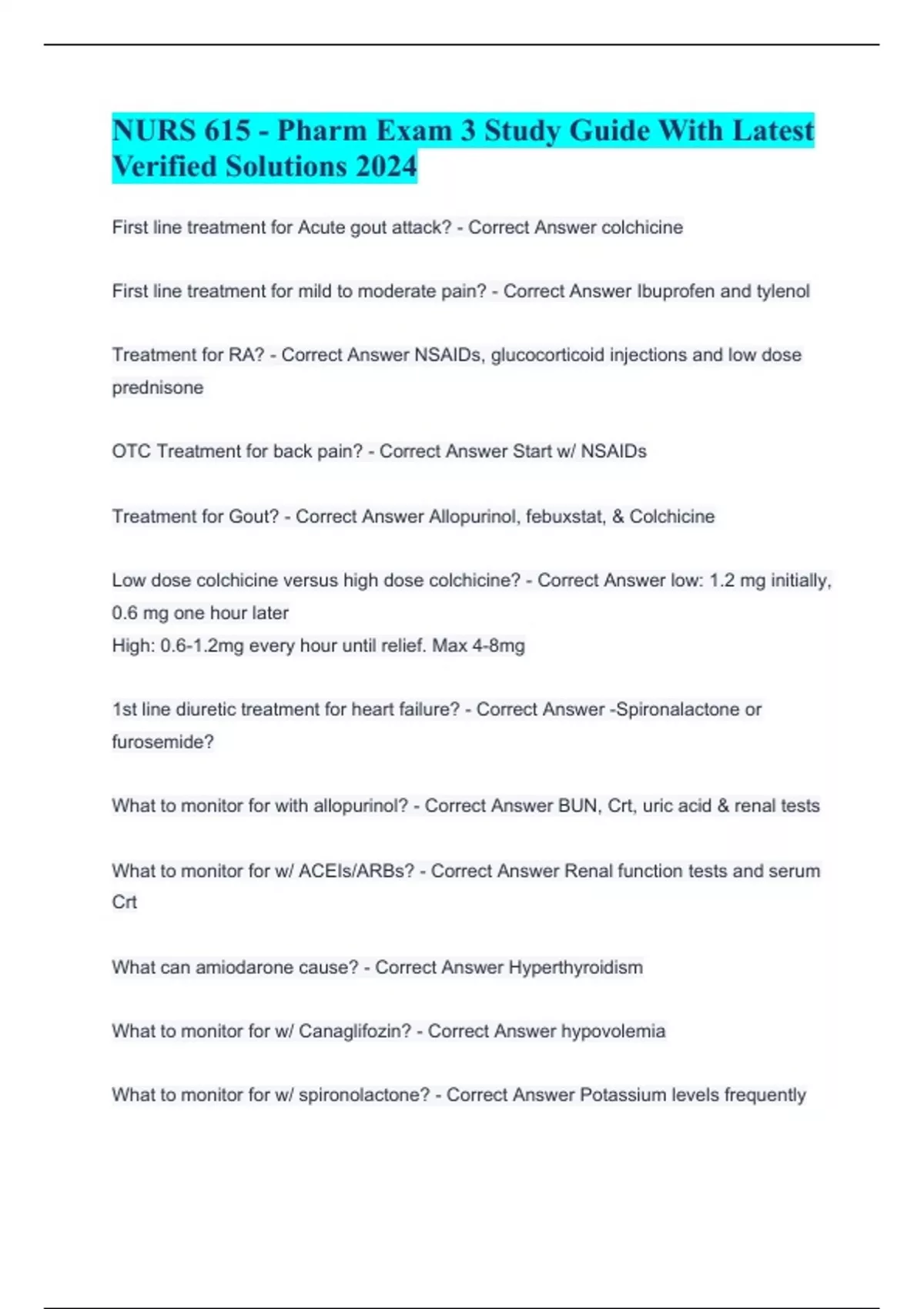 NURS 615 - Pharm Exam 3 Study Guide With Latest Verified Solutions 2024 First line treatment for Acute gout attack? - Correct Answer colchicine First line treatment for mild to moderate pain? - Correct Answer Ibuprofen and tylenol Treatment for RA? - Correct Answer NSAIDs, glucocorticoid injections and low dose prednisone OTC Treatment for back pain? - Correct Answer Start w/ NSAIDs Treatment for Gout? - Correct Answer Allopurinol, febuxstat, & Colchicine Low dose colchicine versus high dose colchicine? - Correct Answer low: 1.2 mg initially, 0.6 mg one hour later High: 0.6-1.2mg every hour until relief. Max 4-8mg 1st line diuretic treatment for heart failure? - Correct Answer -Spironalactone or furosemide? What to monitor for with allopurinol? - Correct Answer BUN, Crt, uric acid & renal tests What to monitor for w/ ACEIs/ARBs? - Correct Answer Renal function tests and serum Crt What can amiodarone cause? - Correct Answer Hyperthyroidism What to monitor for w/ Canaglifozin? - Correct Answer hypovolemia What to monitor for w/ spironolactone? - Correct Answer Potassium levels frequently Education needed with long-term corticosteroid use? - Correct Answer -Never stop abruptly -take prilosec or zantac to protect from GI bleeds -Diabetics may need more insulin -Monitor for signs of infection Education needed for alpha-glucosidase inhibitors? - Correct Answer Must be taken w/ first bite of food from each meal When to take levothyroxine? - Correct Answer Take first thing in the morning on an emptly stomach and no other food/meds within 30 min of it MOA of CCB? - Correct Answer -Prevents the opening of calcium channels, reducing the effect of calcium excitation, contraction, coupling of skeletal, smooth and cardiac muscle, regulating aldosterone and pacemaker signal conduction = decreased contraction strength MOA of metformin? - Correct Answer Stimulates infulin release from pancreatic beta cells to decrease blood glucose