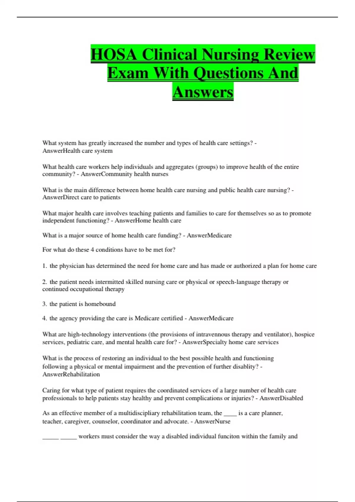 HOSA Clinical Nursing Review Exam With Questions And Answers