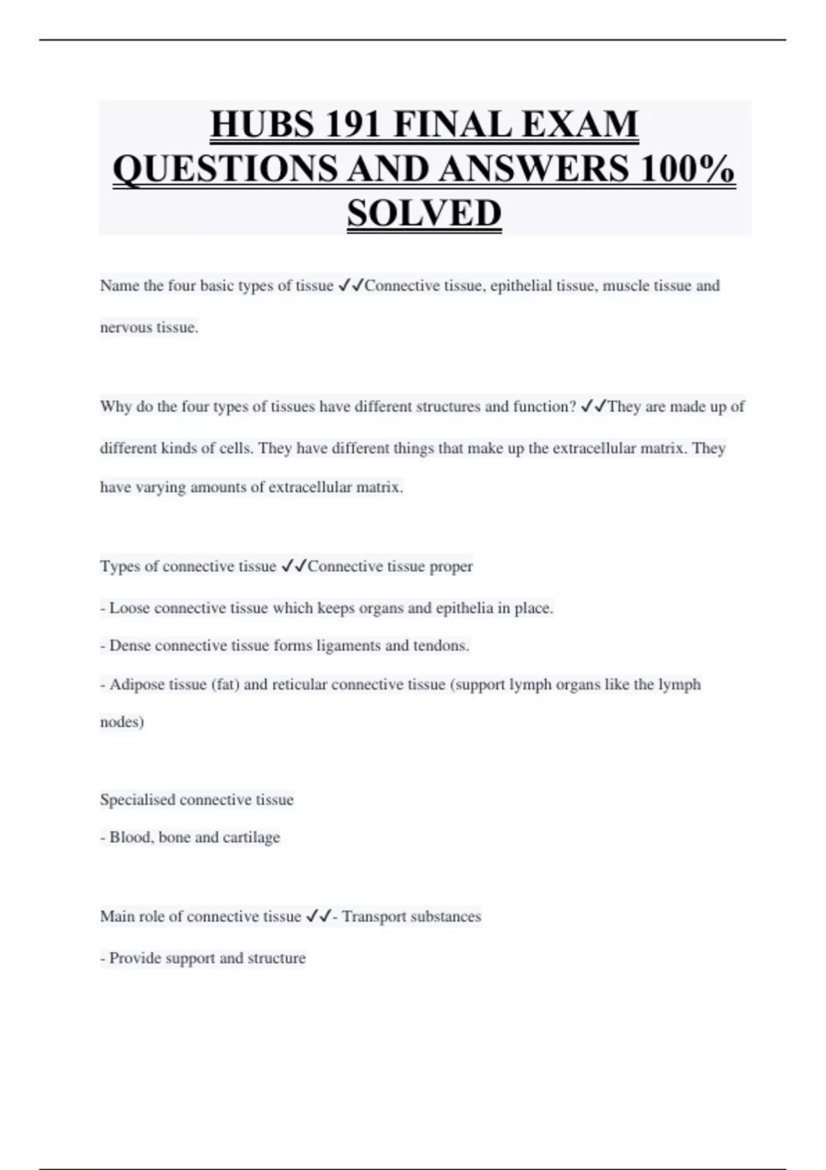 HUBS 191 FINAL EXAM QUESTIONS AND ANSWERS 100% SOLVED Name the four basic types of tissue Connective tissue, epithelial tissue, muscle tissue and nervous tissue. Why do the four types of tissues have different structures and function? They are made up of different kinds of cells. They have different things that make up the extracellular matrix. They have varying amounts of extracellular matrix. Types of connective tissue Connective tissue proper - Loose connective tissue which keeps organs and epithelia in place. - Dense connective tissue forms ligaments and tendons. - Adipose tissue (fat) and reticular connective tissue (support lymph organs like the lymph nodes)
