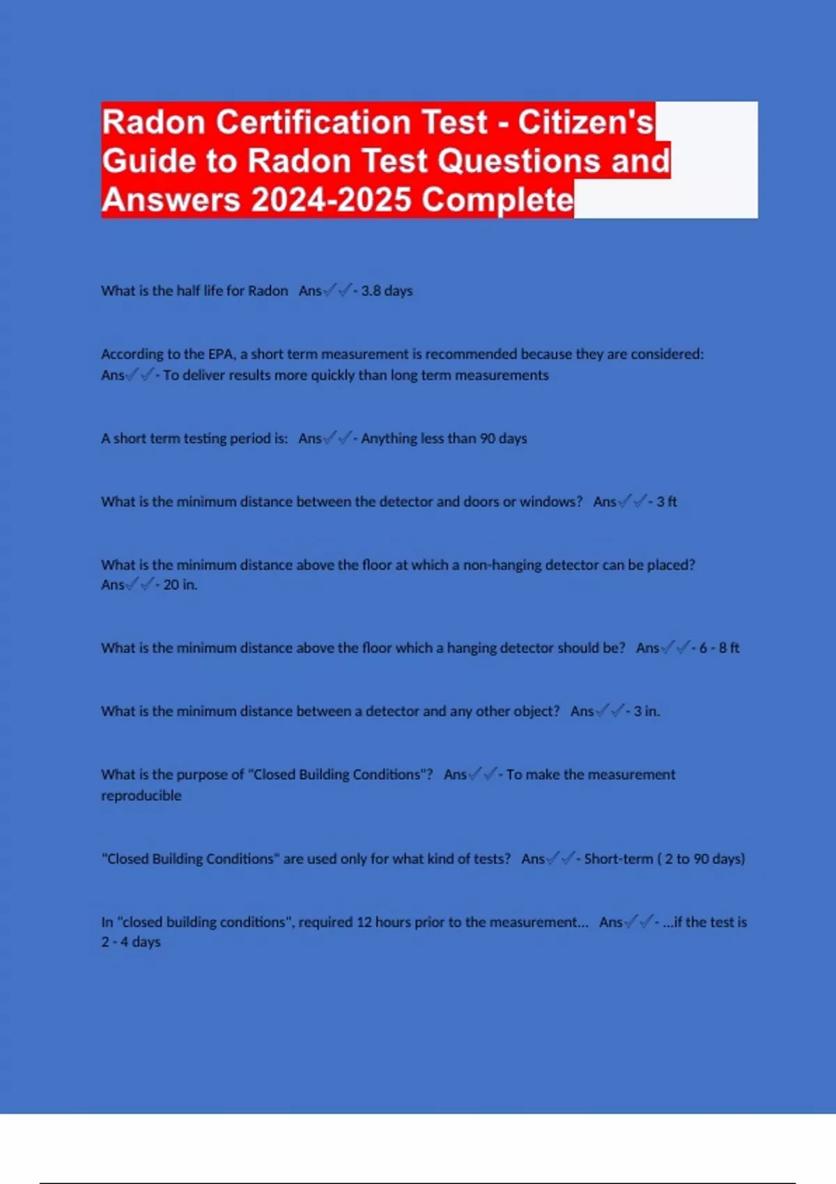 Radon Certification Test - Citizen's Guide to Radon Test Questions and Answers Complete