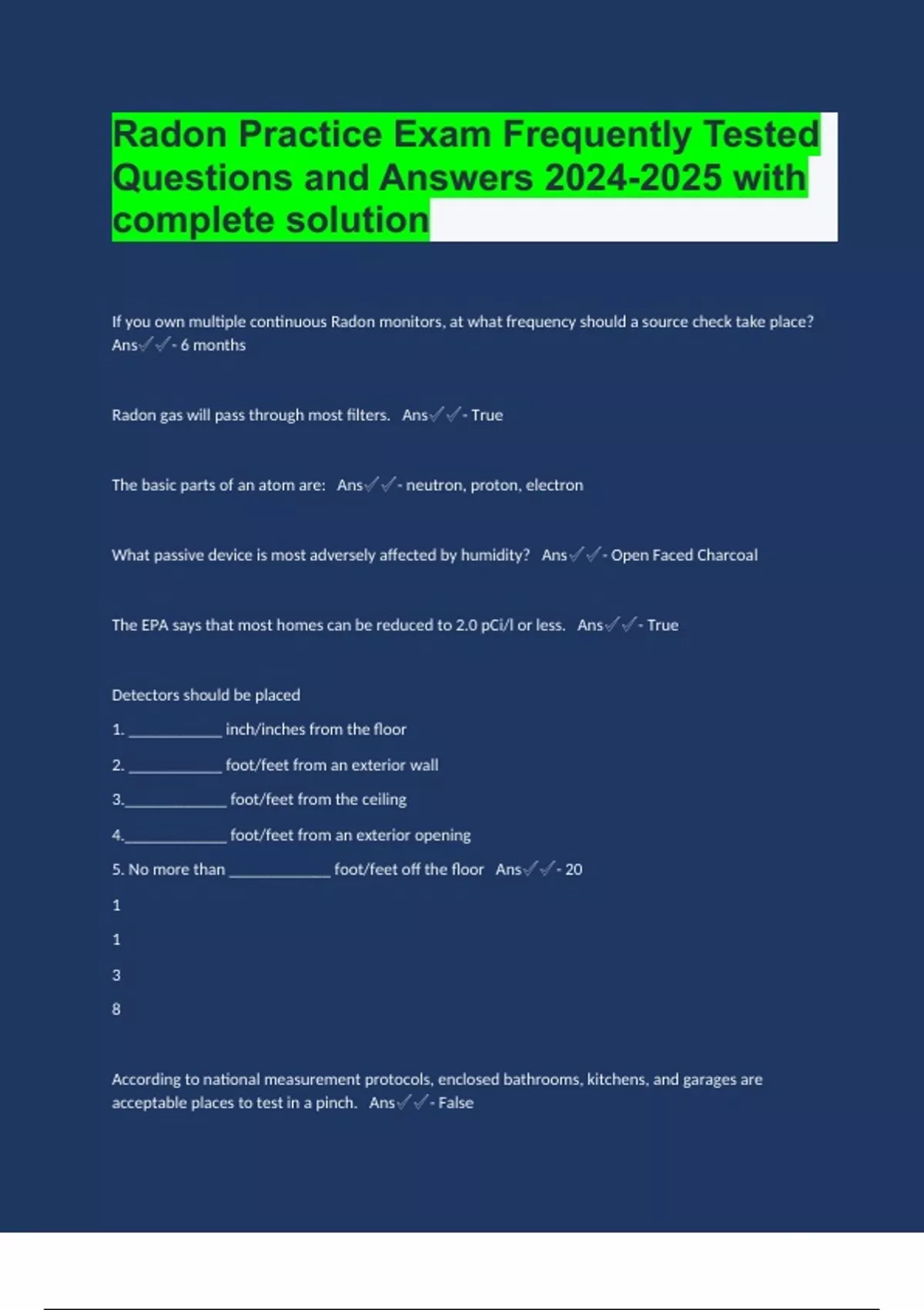 Radon Practice Exam Frequently Tested Questions and Answers with complete solution