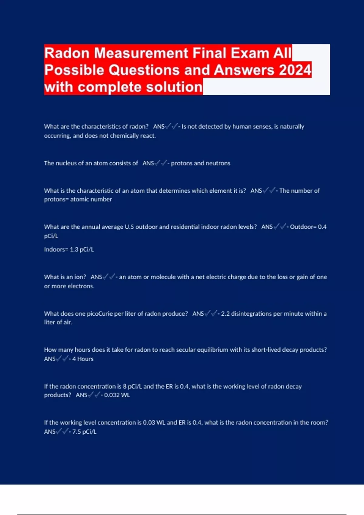 Radon Measurement Final Exam All Possible Questions and Answers 2024 with complete solution