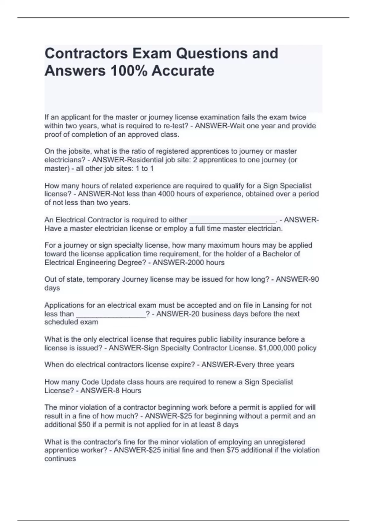 Contractors Exam Questions and Answers 100% Accurate