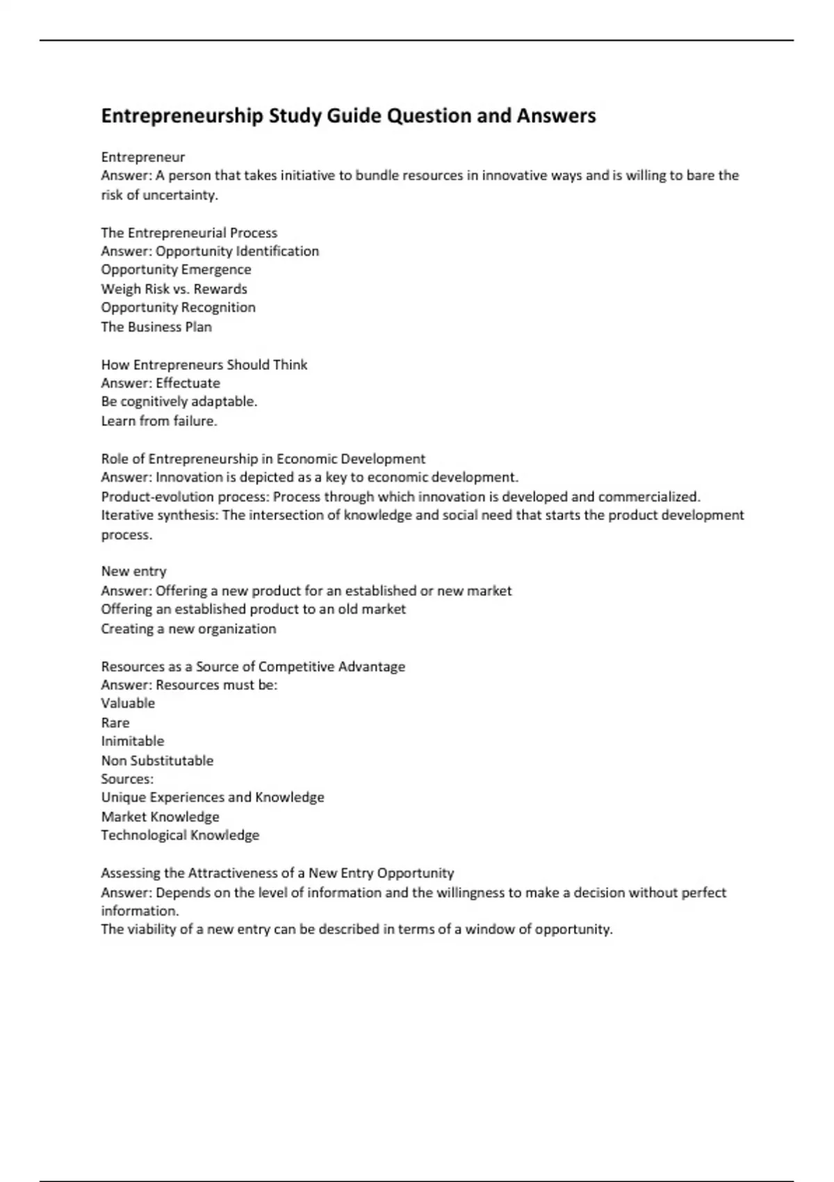 Entrepreneurship Study Guide Question and Answers