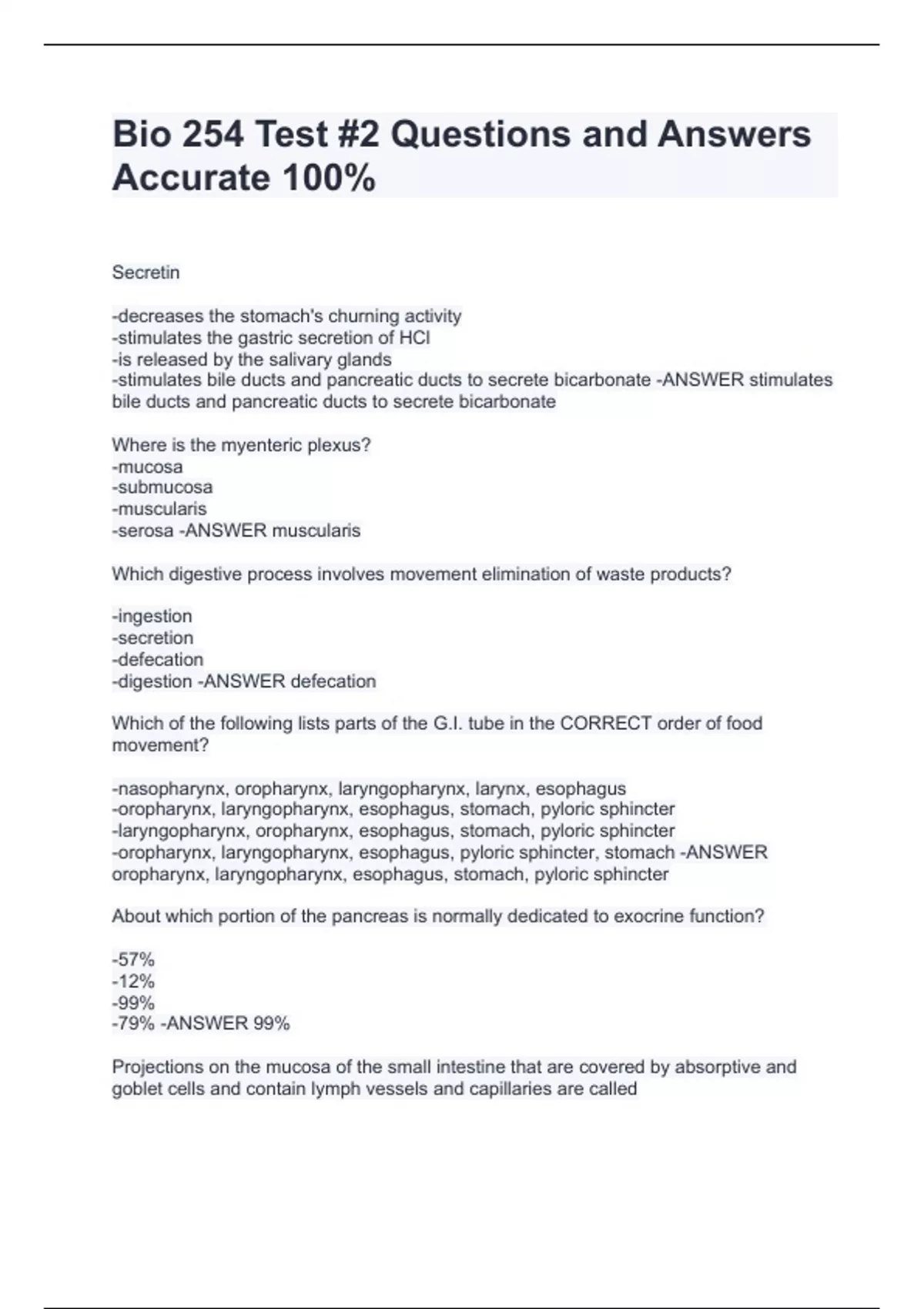 Bio 254 Test #2 Questions and Answers Accurate 100%Bio 254 Test #2 Questions and Answers Accurate 100%Bio 254 Test #2 Questions and Answers Accurate 100%Bio 254 Test #2 Questions and Answers Accurate 100% Secretin -decreases the stomach's churning activity -stimulates the gastric secretion of HCl -is released by the salivary glands -stimulates bile ducts and pancreatic ducts to secrete bicarbonate -ANSWER stimulates bile ducts and pancreatic ducts to secrete bicarbonate Where is the myenteric plexus? -mucosa -submucosa -muscularis -serosa -ANSWER muscularis Which digestive process involves movement elimination of waste products?
