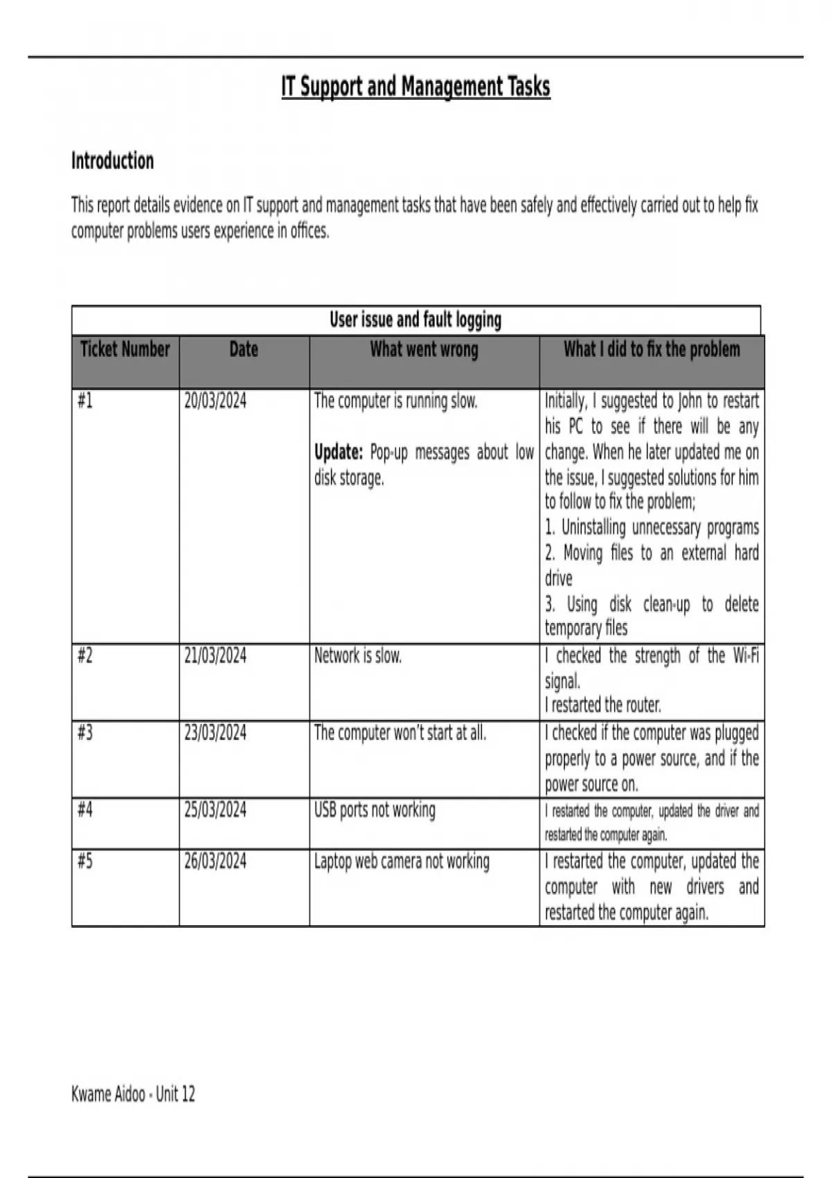 This report details evidence on IT support and management tasks that have been safely and effectively carried out to help fix