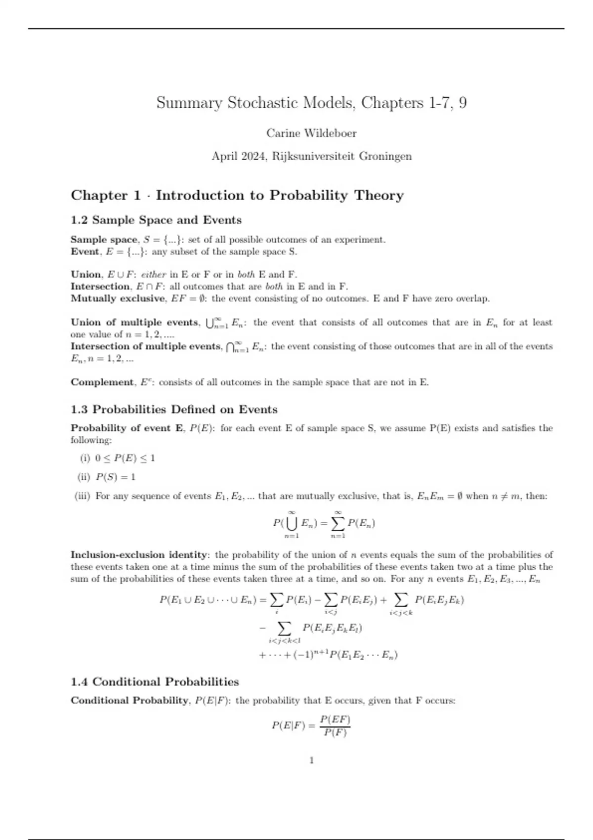 Summary Stochastic Models, Chapters 1-7, 9