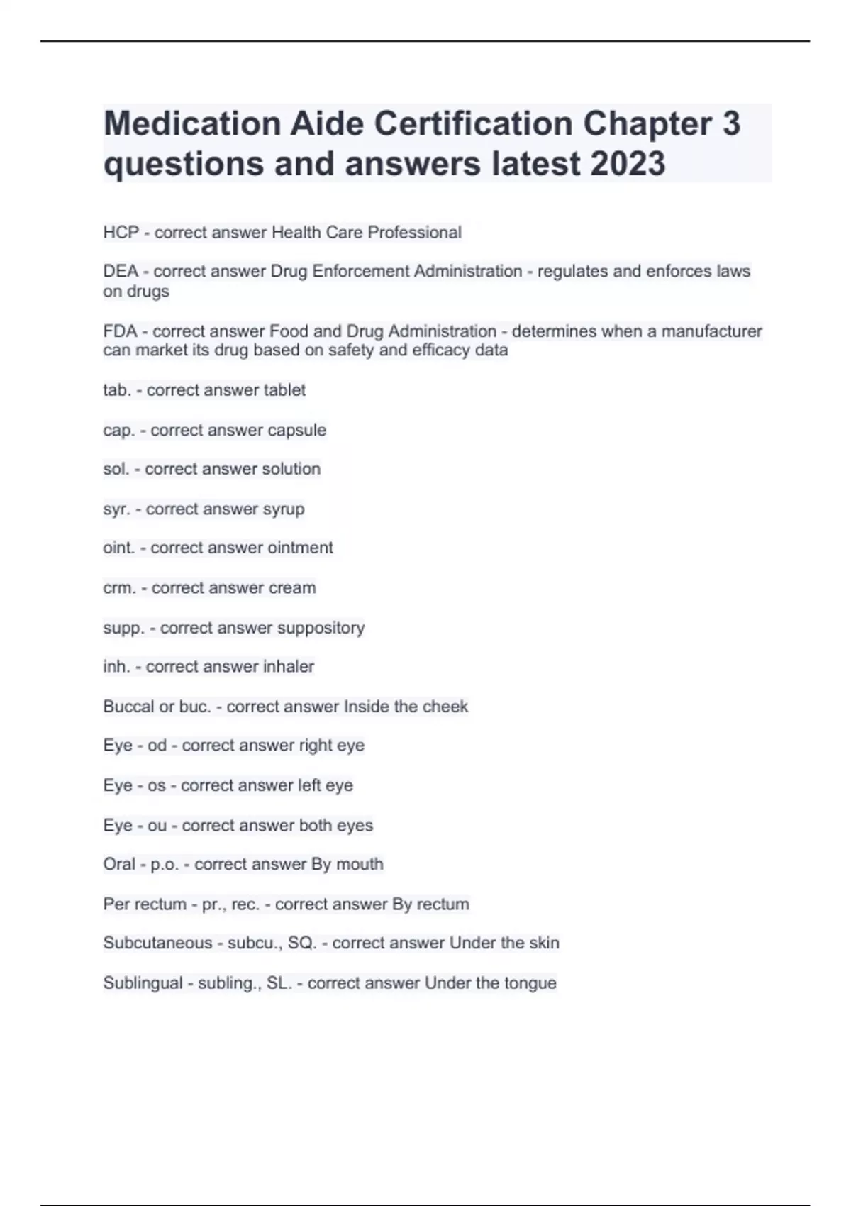 Medication Aide Certification Chapter 3 questions and answers latest 2023HCP - correct answer Health Care Professional DEA - correct answer Drug Enforcement Administration - regulates and enforces laws on drugs FDA - correct answer Food and Drug Administration - determines when a manufacturer can market its drug based on safety and efficacy data tab. - correct answer tablet cap. - correct answer capsule sol. - correct answer solution syr. - correct answer syrup oint. - correct answer ointment crm. - correct answer cream supp. - correct answer suppository inh. - correct answer inhaler Buccal or buc. - correct answer Inside the cheek Eye - od - correct answer right eye Eye - os - correct answer left eye Eye - ou - correct answer both eyes Oral - p.o. - correct answer By mouth Per rectum - pr., rec. - correct answer By rectum Subcutaneous - subcu., SQ. - correct answer Under the skin Sublingual - subling., SL. - correct answer Under the tongue